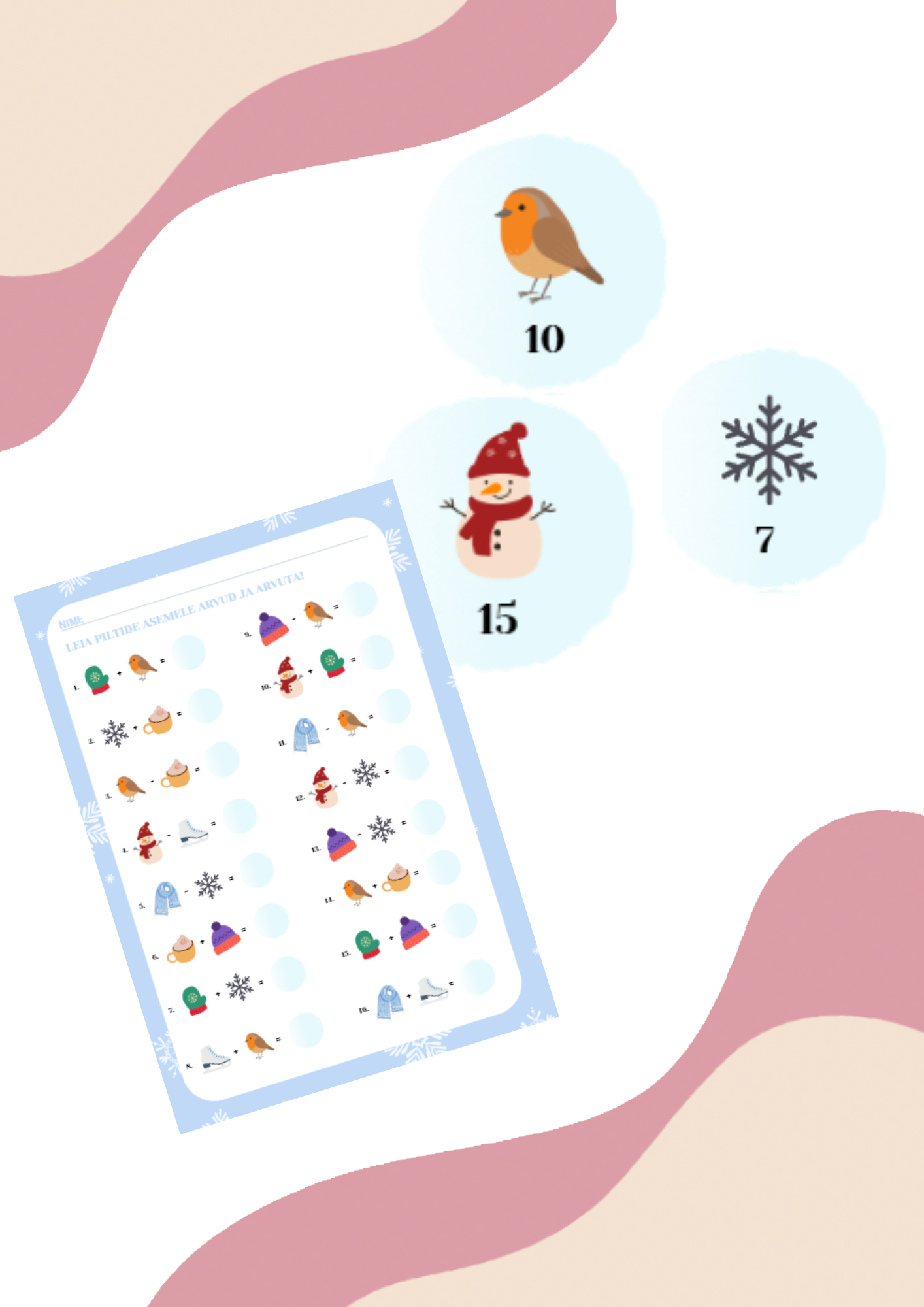 Laps leiab lumepallilt õige pildi ja sellele vastava numbri, seejärel arvutab. Liitmis- ja lahutamistehted on 20- piires.