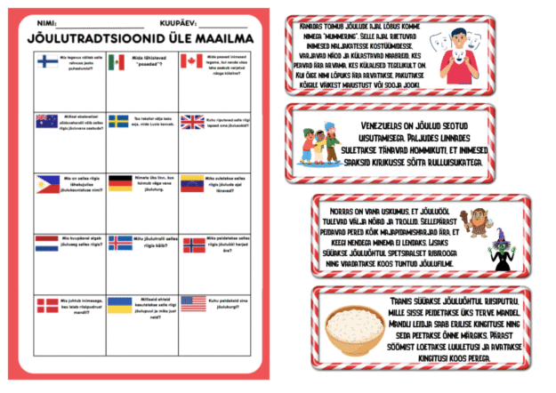 Tööleht – õpilased peavad riigi lipu ja vihje küsimuse abil vastama, kuidas jõuluaega konkreetses riigis tähistatakse.