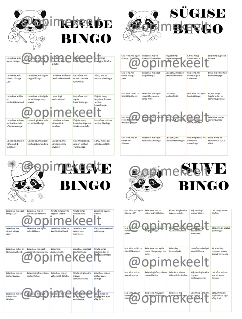 4 .pdf faili bingo-mänguga. Peale lahendamist on võimalik ka pilti värvida. Bingo hõlmab mitut ainet ning on sobilik ka keeleõppeks.