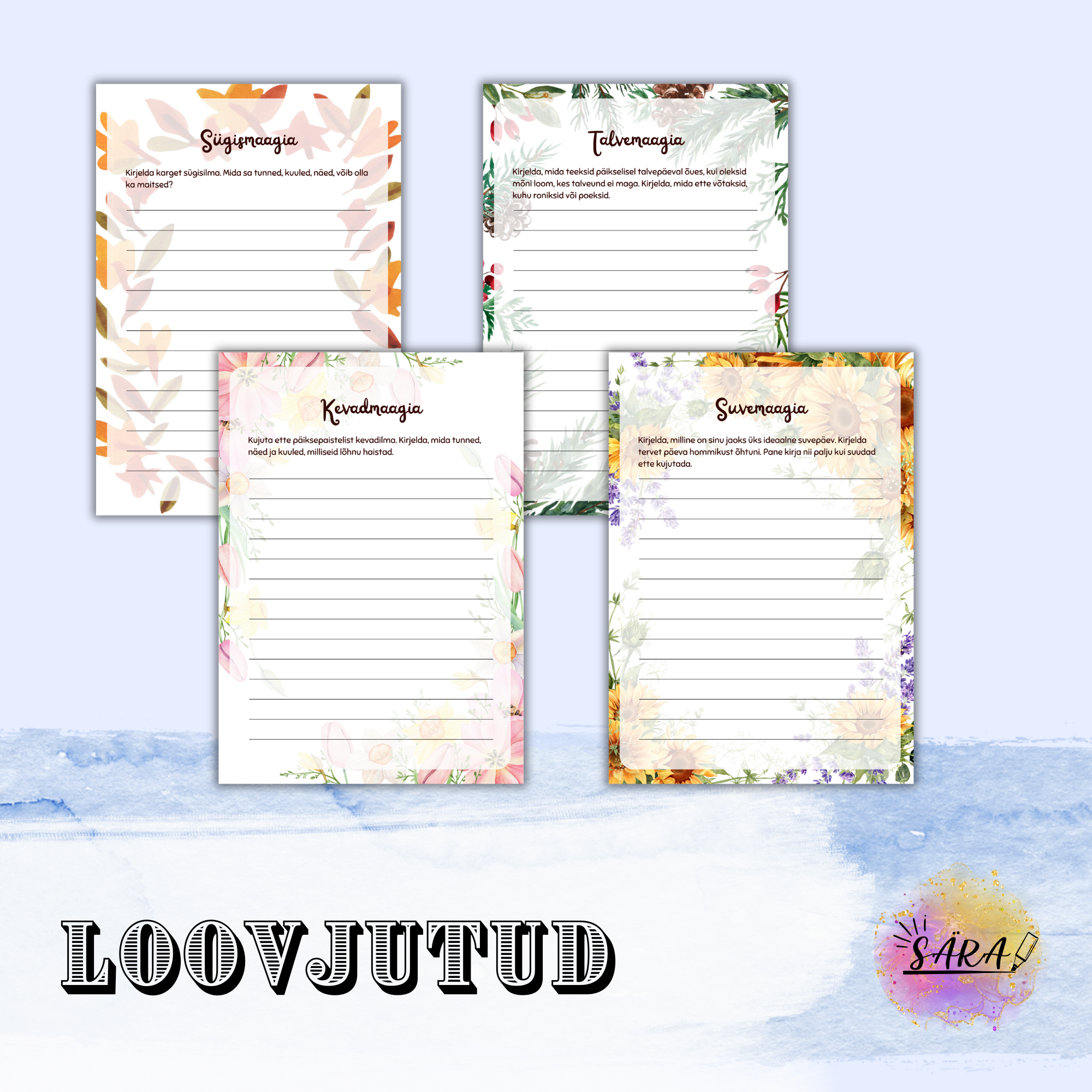 Fail sisaldab 4 aastaajaga seostatud jutu teemasid. Iga aastaaja kohta on 3 erinevat juttu suunavat peamõtet (kokku 12 lk). Teemad on kirjutatud nii, et need suunaksid õpilast mõtlema detailidele ja omadus- ning tegusõnade rohkusele. Lisaks aitavad need ülesanded arendada tunnete ja meeltega seotud maailma, samastumise kunsti ja muidugi ka loovat mõtlemist.