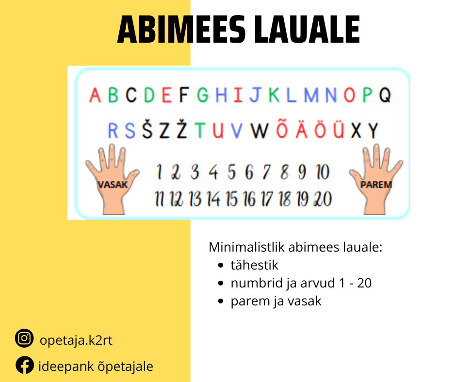 Abimees koosneb tähestikust, numbritest ja arvudest 1 kuni 20 ning mõistetest parem ja vasak.