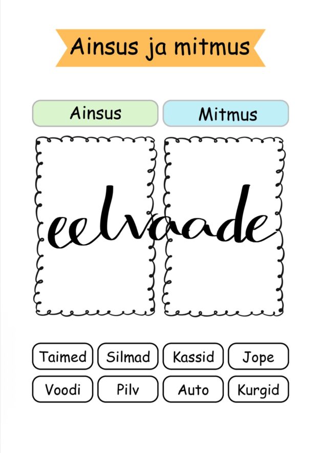 3 samasugust töölehte ainsuse ja mitmuse õppimiseks. Igal lehel on erinevad sõnad, mis tuleb kirjutada õigesse kasti.