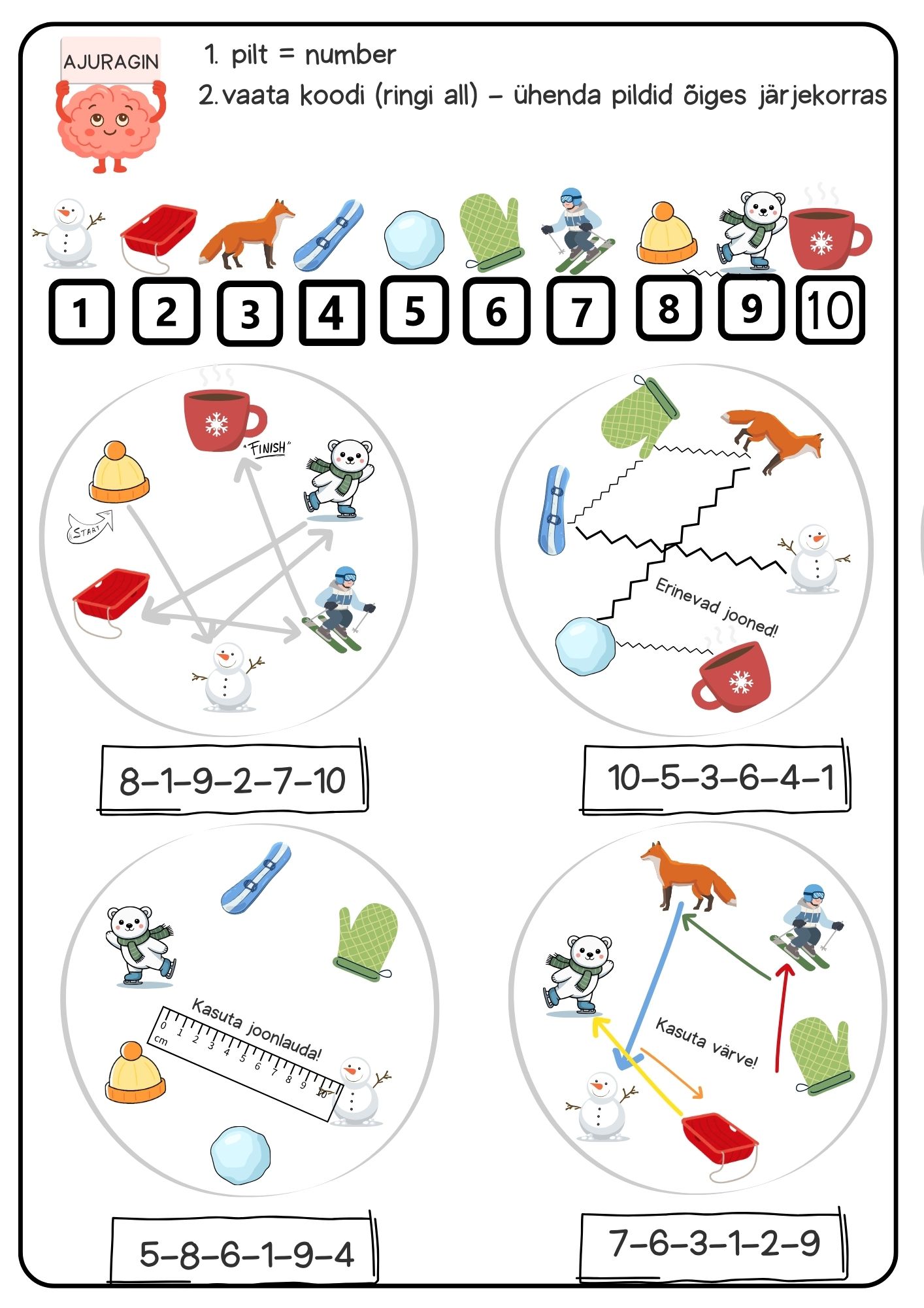 - peenmotoorika ja silma-käe koordinatsioon (joonte ühendamine),