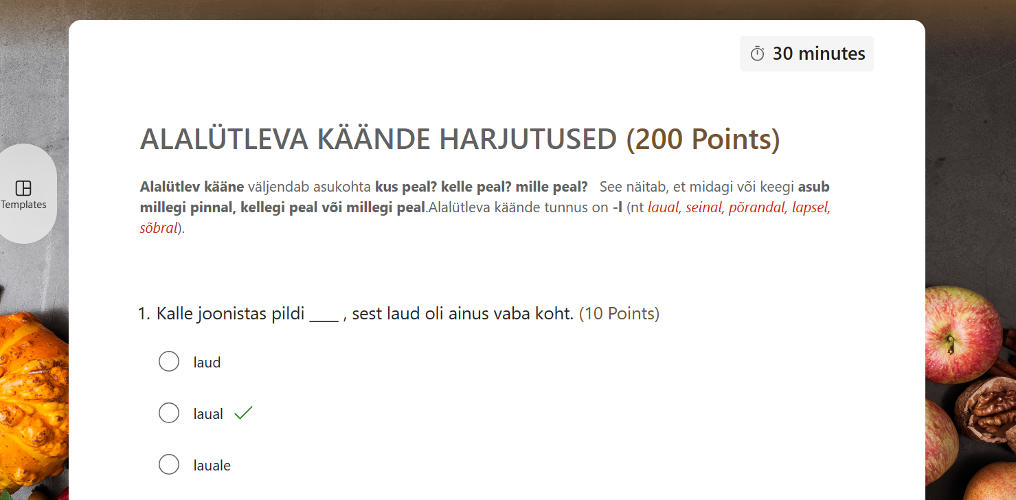 Õppija peab iga lause juures valima sõna, mis on alalütlevas käändes. Ülesanne sisaldab 20 valikvastusega küsimust, mis on selged ja jõukohased nii 2.–5. klassi õpilastele kui ka täiskasvanutele, kes õpivad eesti keelt A1–A2 tasemel. Iga õige vastus annab 10 punkti, maksimaalne tulemus on 200 punkti, ning lahendamiseks on ette nähtud 30 minutit.