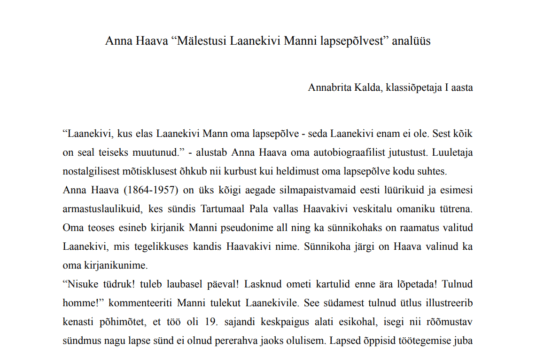 Anna Haava “Mälestusi Laanekivi Manni lapsepõlvest” analüüs