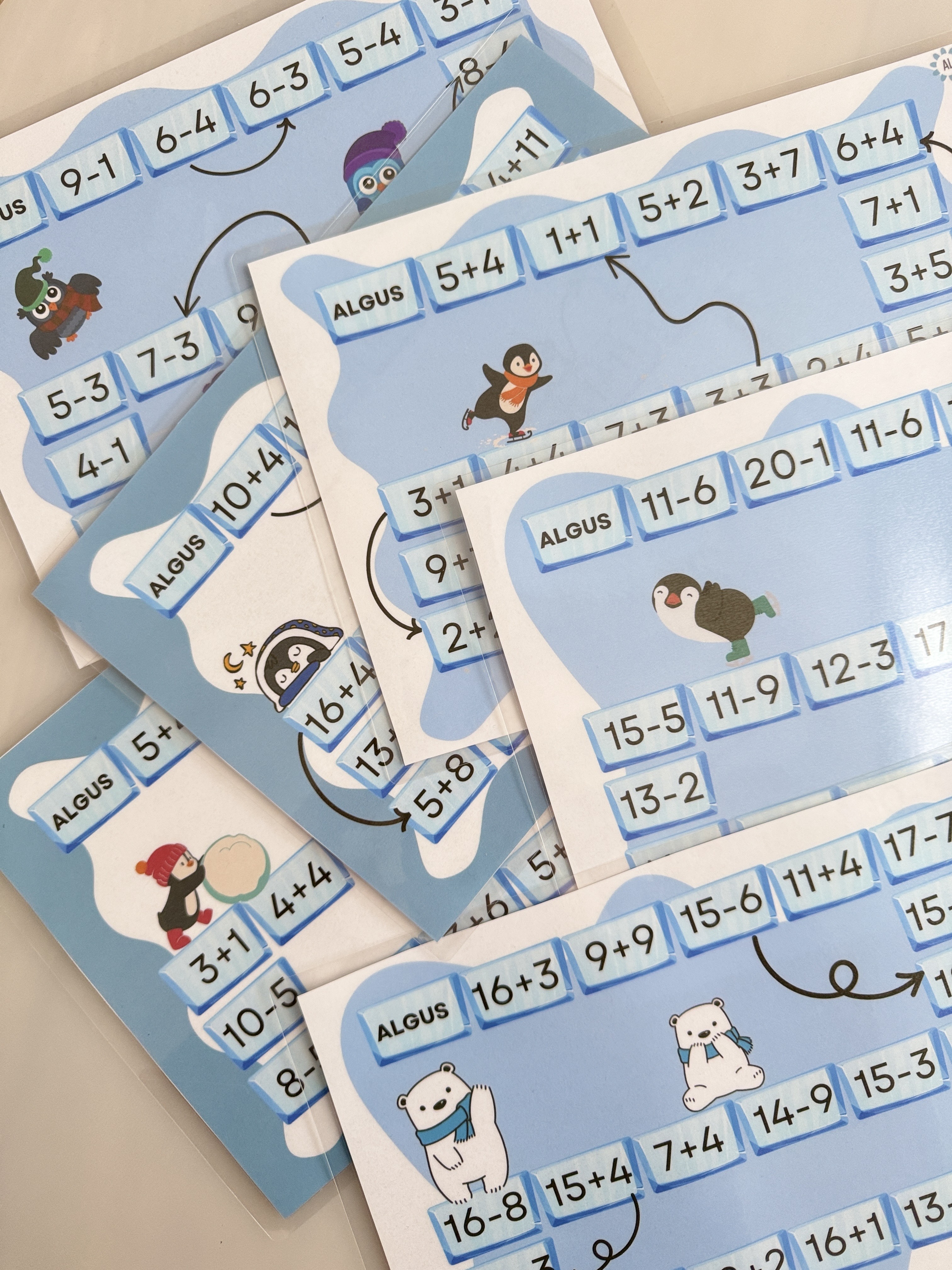 Need talveteemalised lauamängud aitavad lastel harjutada 20 piires liitmist ja lahutamist lõbusas ja kaasahaaravas vormis. Komplektis on 6 mängualust arvutamisülesannetega.