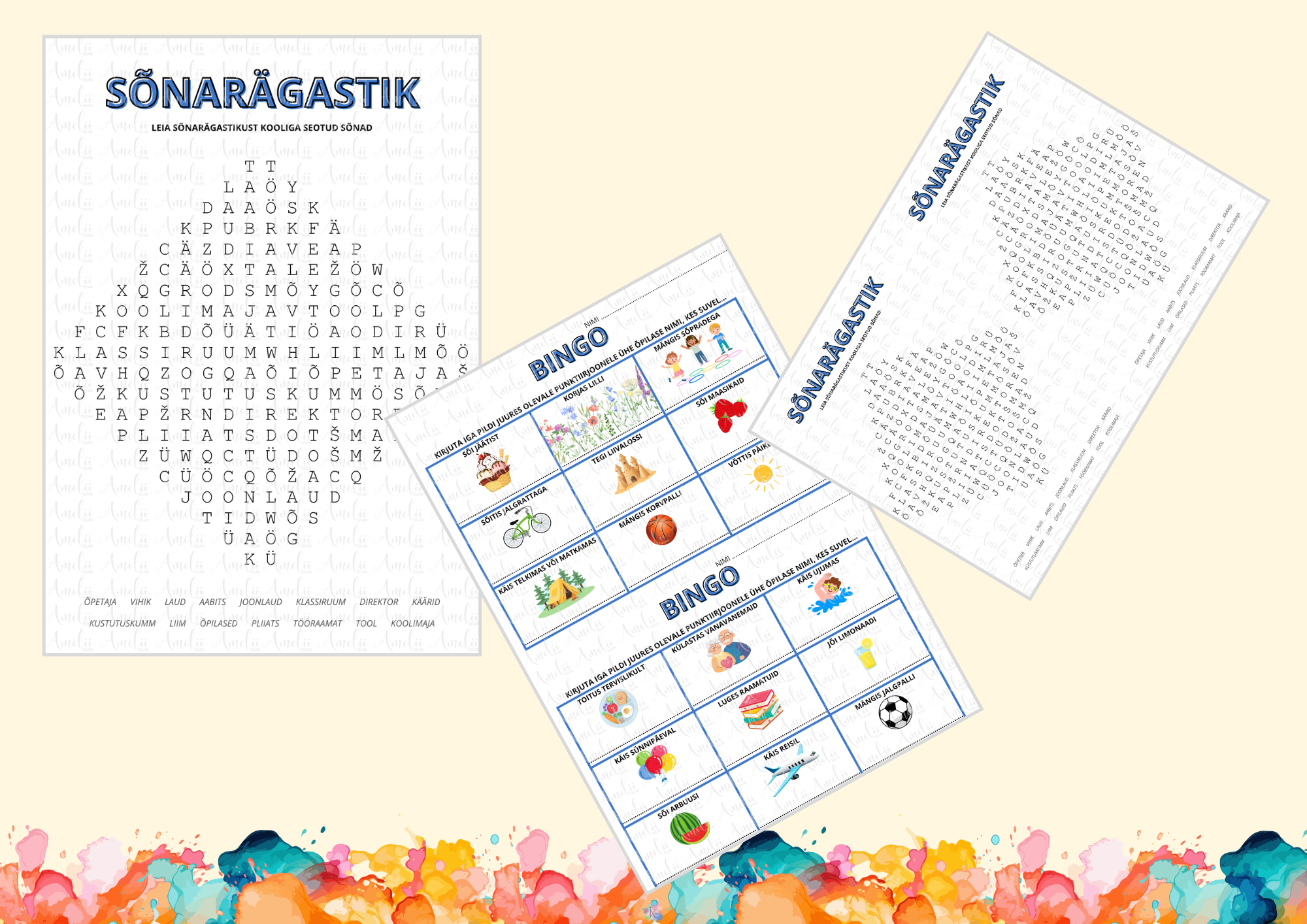 Lõbus ja arendav töölehtede komplekt, mis sisaldab suvist BINGO-mängu ja kooliteemalist sõnarägastikku. Sobib ideaalselt algklasside lastele õppimiseks läbi mängu nii koolis kui kodus.