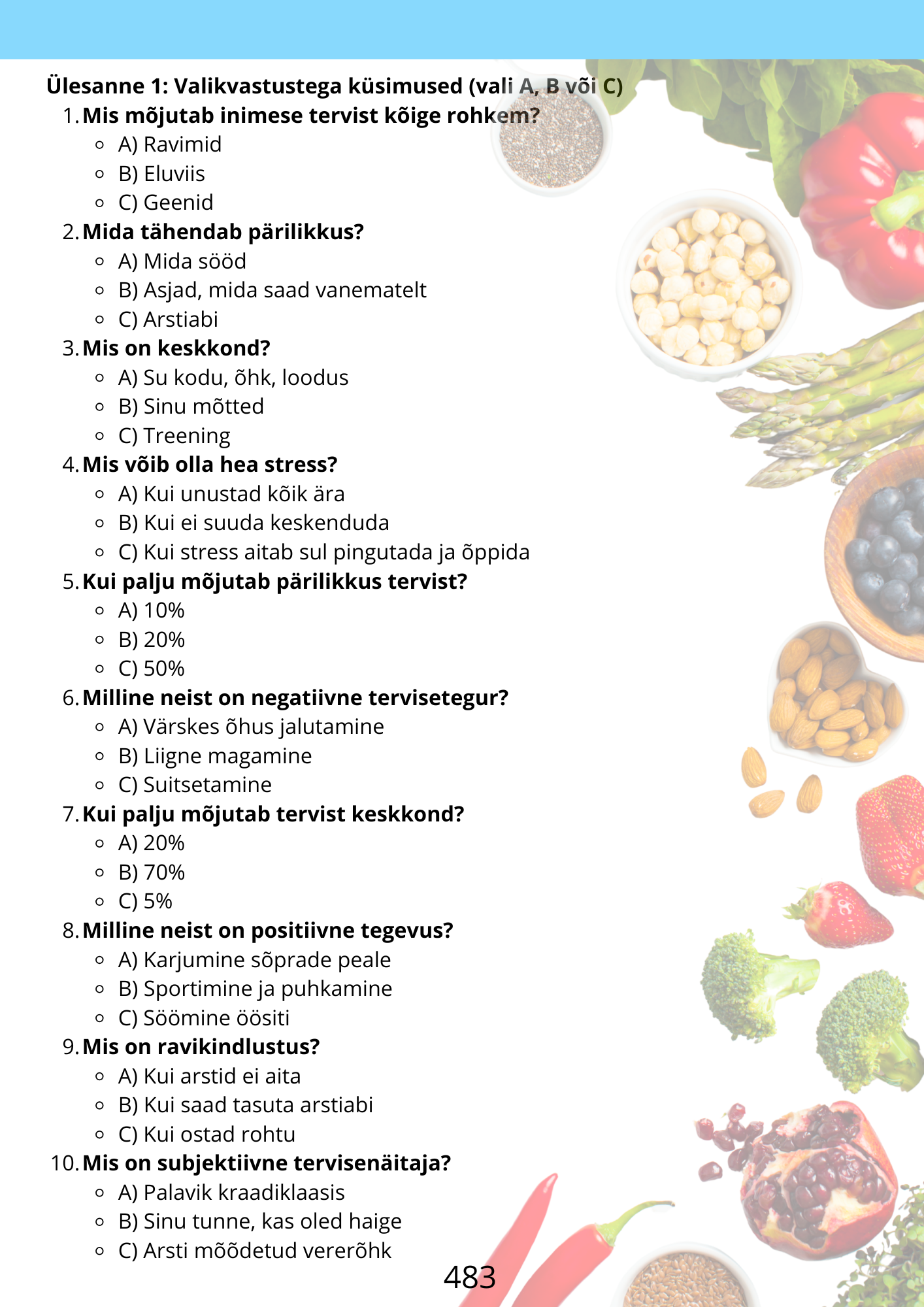 Tervisliku eluviisi peatükid tutvustavad toitumise põhimõtteid, toidugruppe, toidupüramiidi, toitumist mõjutavaid tegureid ning päevamenüü koostamist. Õpilased õpivad tegema teadlikke valikuid ja mõistma tasakaalustatud toitumise tähtsust.