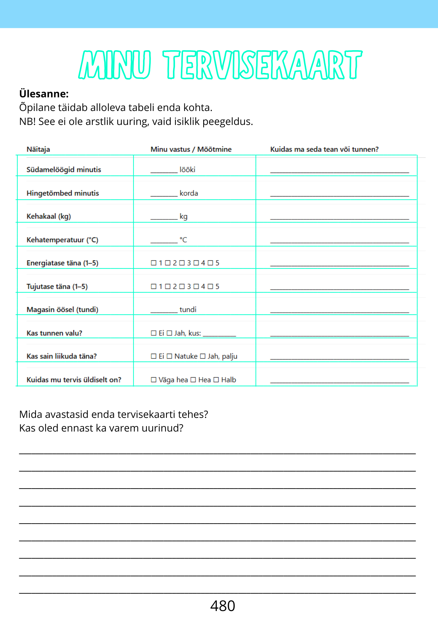 Tööraamatus käsitletakse tervise olemust, tervisenäitajaid, tervist mõjutavaid tegureid, stressi, tervislikku toitumist, kehalist aktiivsust, karastamist, päevakava ja töö‑puhkuse tasakaalu. Harjutused on diferentseeritud ning sobivad tunnitööks, kodutööks ja tugiõppeks.