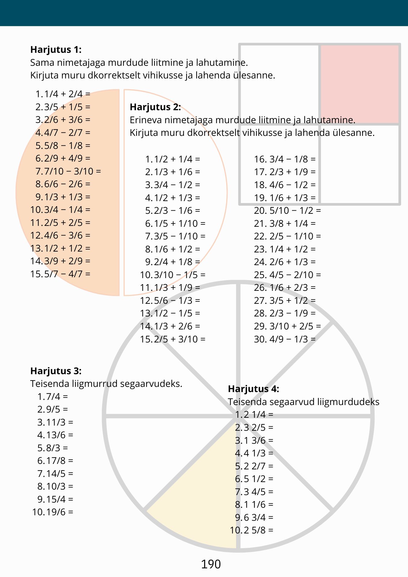 Peastarvutamise osa arendab arvutuskiirust ja täpsust, pakkudes liitmise, lahutamise, korrutamise ja jagamise harjutusi. Kirjaliku liitmise ja lahutamise peatükid selgitavad samm‑sammult, kuidas arvud veergudesse paigutada, kuidas „laenata“ ning kuidas tulemust kontrollida. Järgarvude teema seob matemaatika igapäevaeluga (kuupäevad, järjekorrad, sajandid).