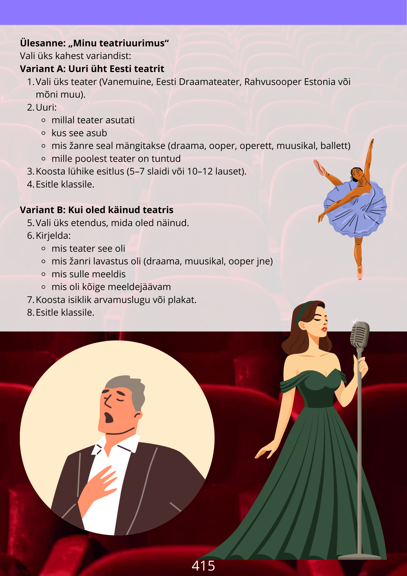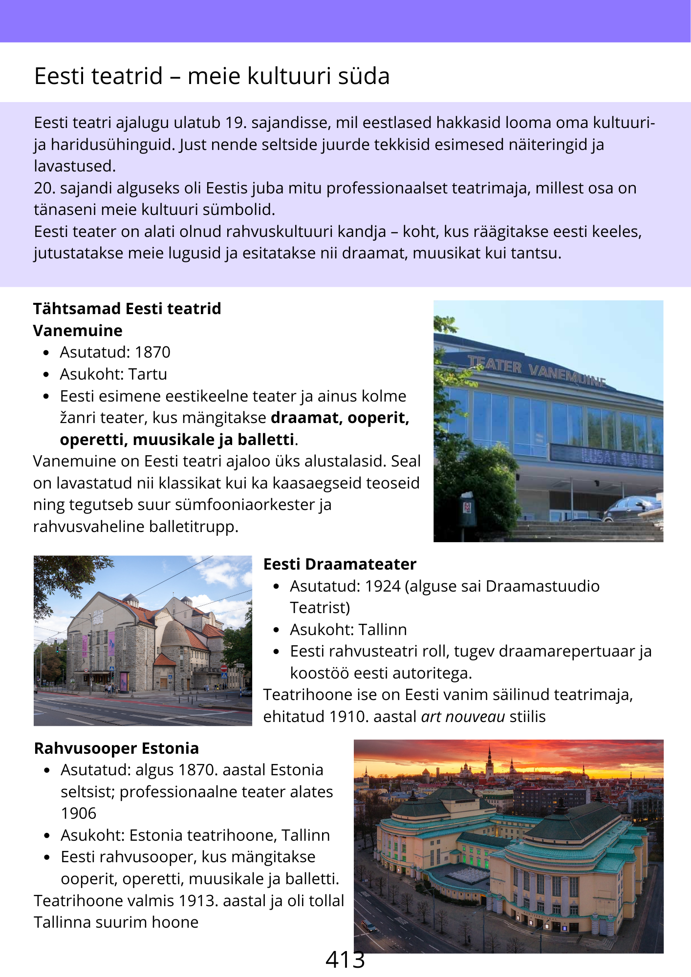 Eesti teatrid – meie kultuuri süda, tähtsamad Eesti teatrid, muusikateatri mõisted, ülesanded.