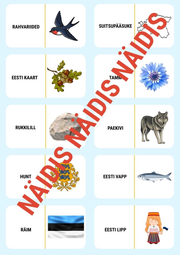 Doomino Eesti sümbolite õppimiseks ja lugemise harjutamiseks. Sõnad on kirjutatud trükitähtedega. Mängu eesmärk on leida pilt ja sõna, mis sobivad omavahel kokku.
