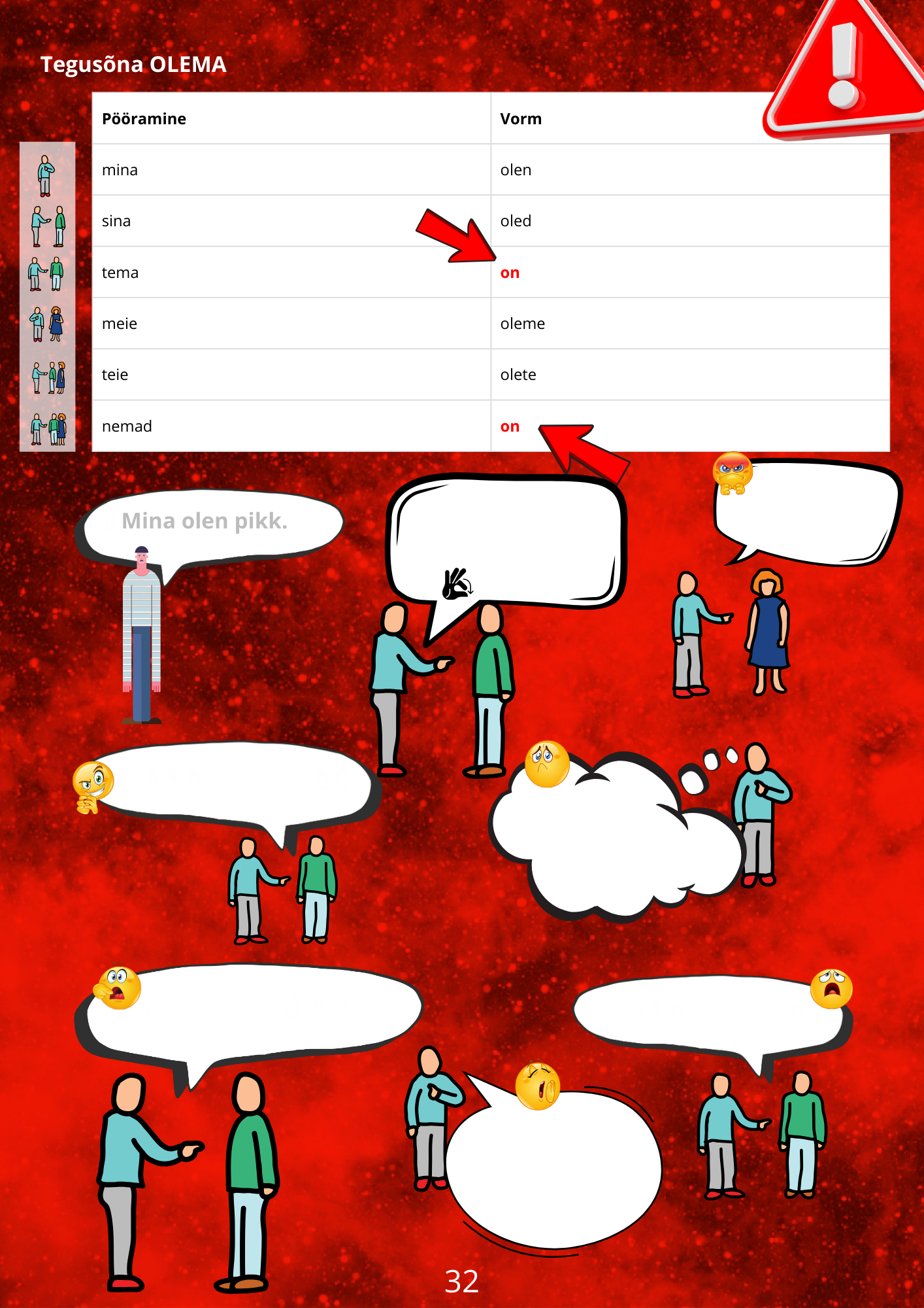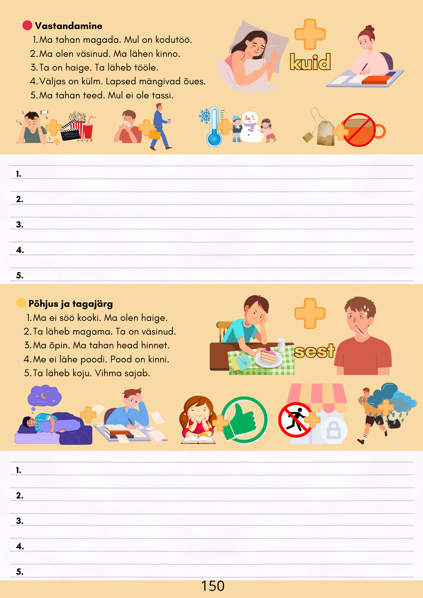 - Dialooge ja situatsiooniharjutusi, mis aitavad õppijal keelt kasutada praktilistes olukordades (nt poes, arsti juures, restoranis, bussipeatuses).