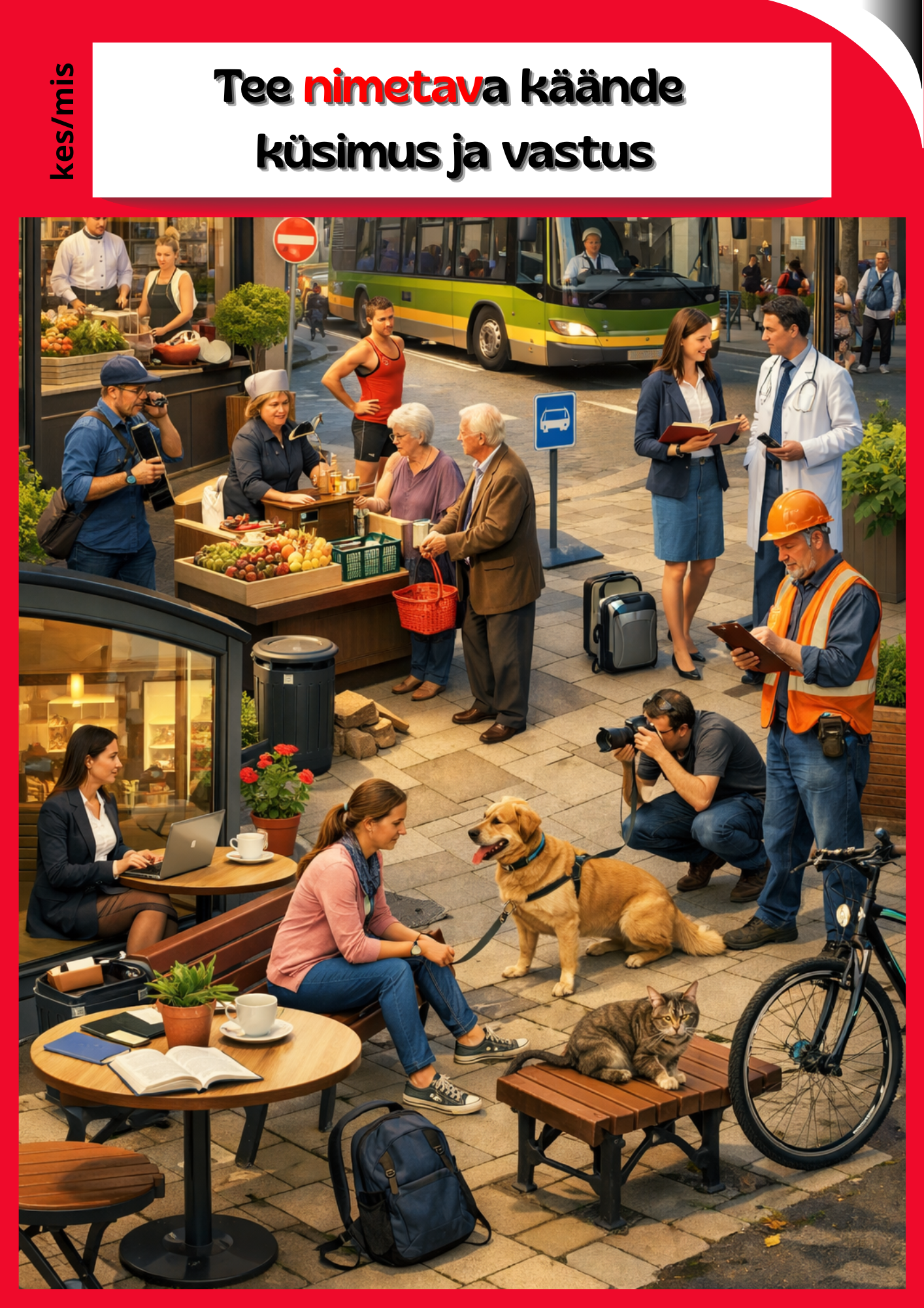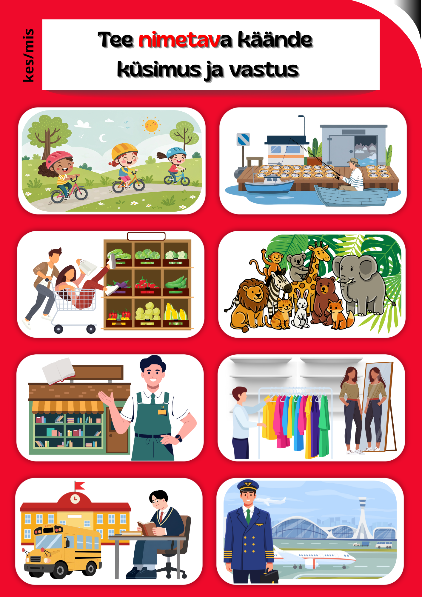 Eesti keele A4 käänetekaartide 3. tase on loodud selleks, et õppija õpiks käändeküsimusi kasutama aktiivselt ja loomulikult. Kaardi ühel poolel on pildid, mille põhjal õppija peab meenutama vastava käände küsimusi (nt kes? mis?, keda? mida?, kellele? millele?). Teisel poolel on suurem situatsioonipilt, mis sobib paaris- ja rühmatööks: õppijad esitavad üksteisele küsimusi ja vastavad neile, treenides nii mälu, lauseehitust kui ka suulist väljendust. See komplekt on ideaalne samm pärast käändelõppude õppimist ja küsimustele vastamist — nüüd on fookus küsimuste moodustamisel ja aktiivsel suhtlusel.