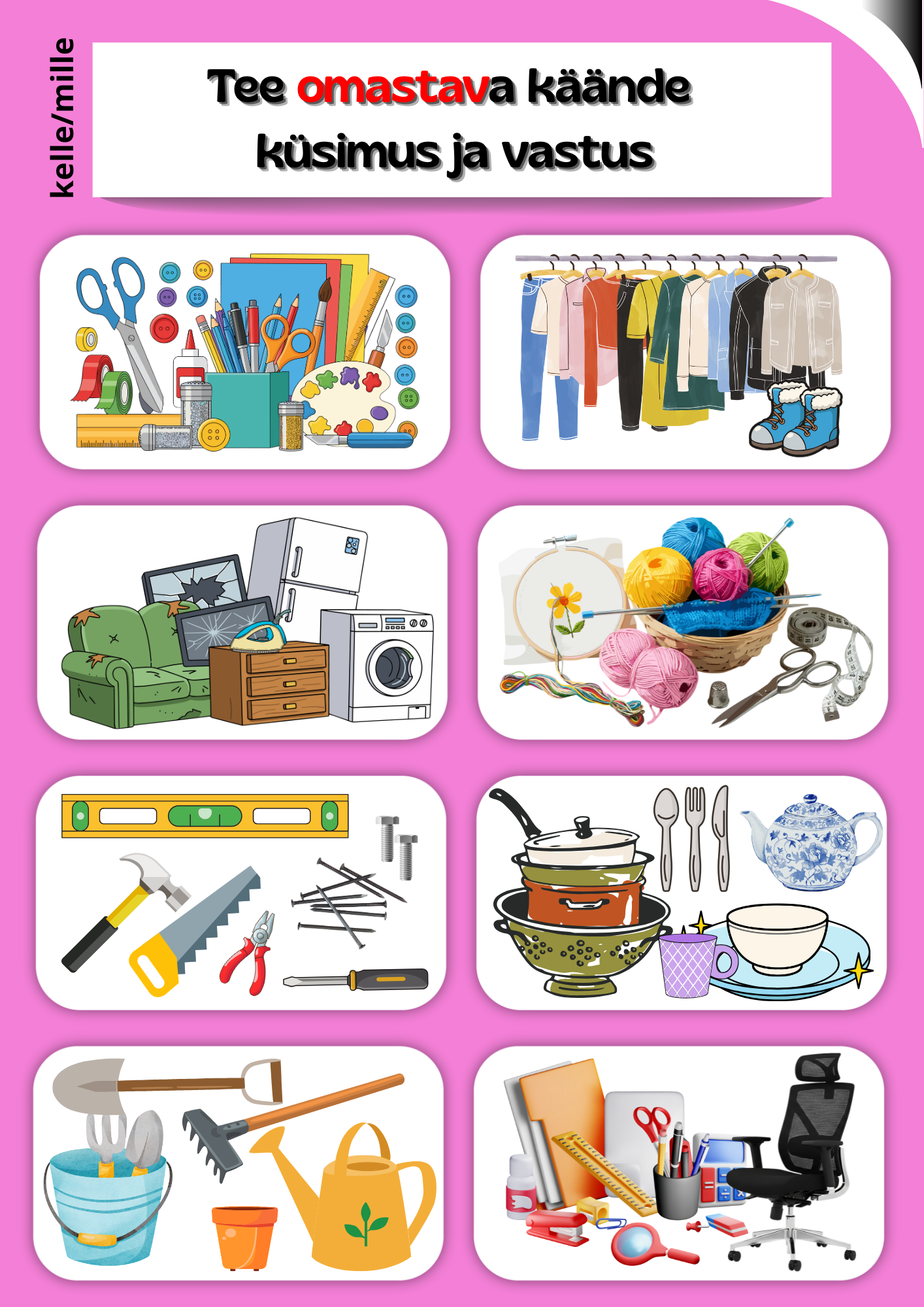 Kaardi esiküljel on väikesed pildid, mis suunavad õppijat meenutama vastava käände küsimusi (nt nimetav – kes? mis?, osastav – keda? mida?, alaleütlev – kellele? millele?). Kaardi tagaküljel on suurem situatsioonipilt, mis sobib paaris- ja rühmatööks: õppijad esitavad üksteisele küsimusi, vastavad neile ja moodustavad ise lauseid. See toetab nii mälutreeningut, suulist väljendust kui ka grammatilist paindlikkust.