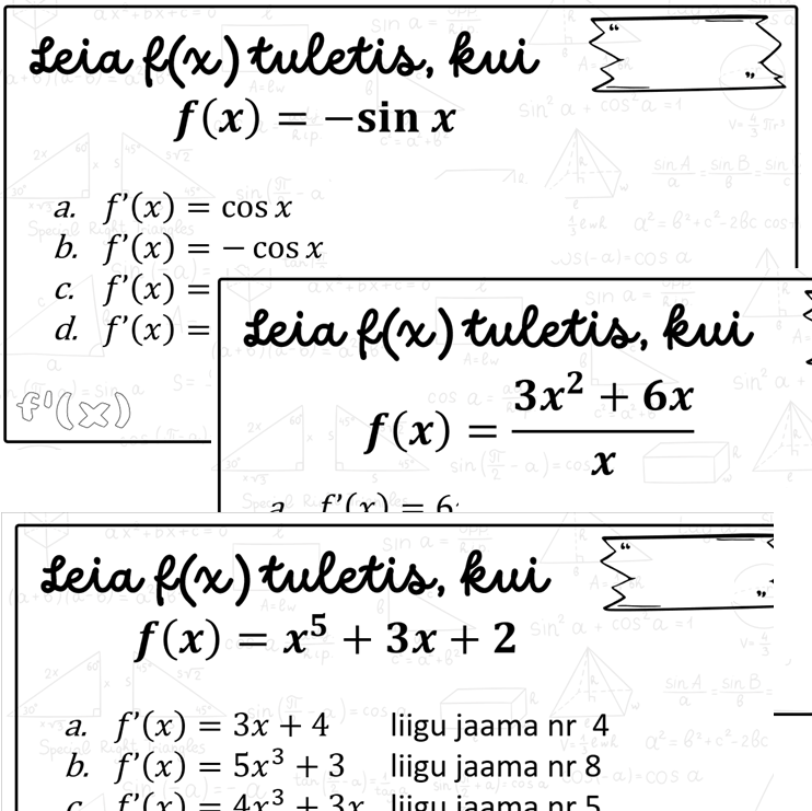 Elementaarfunktsioonide, summa, vahe ning konstandiga korrutamise tuletis. Ringliikumise ülesanne valikvastustega.