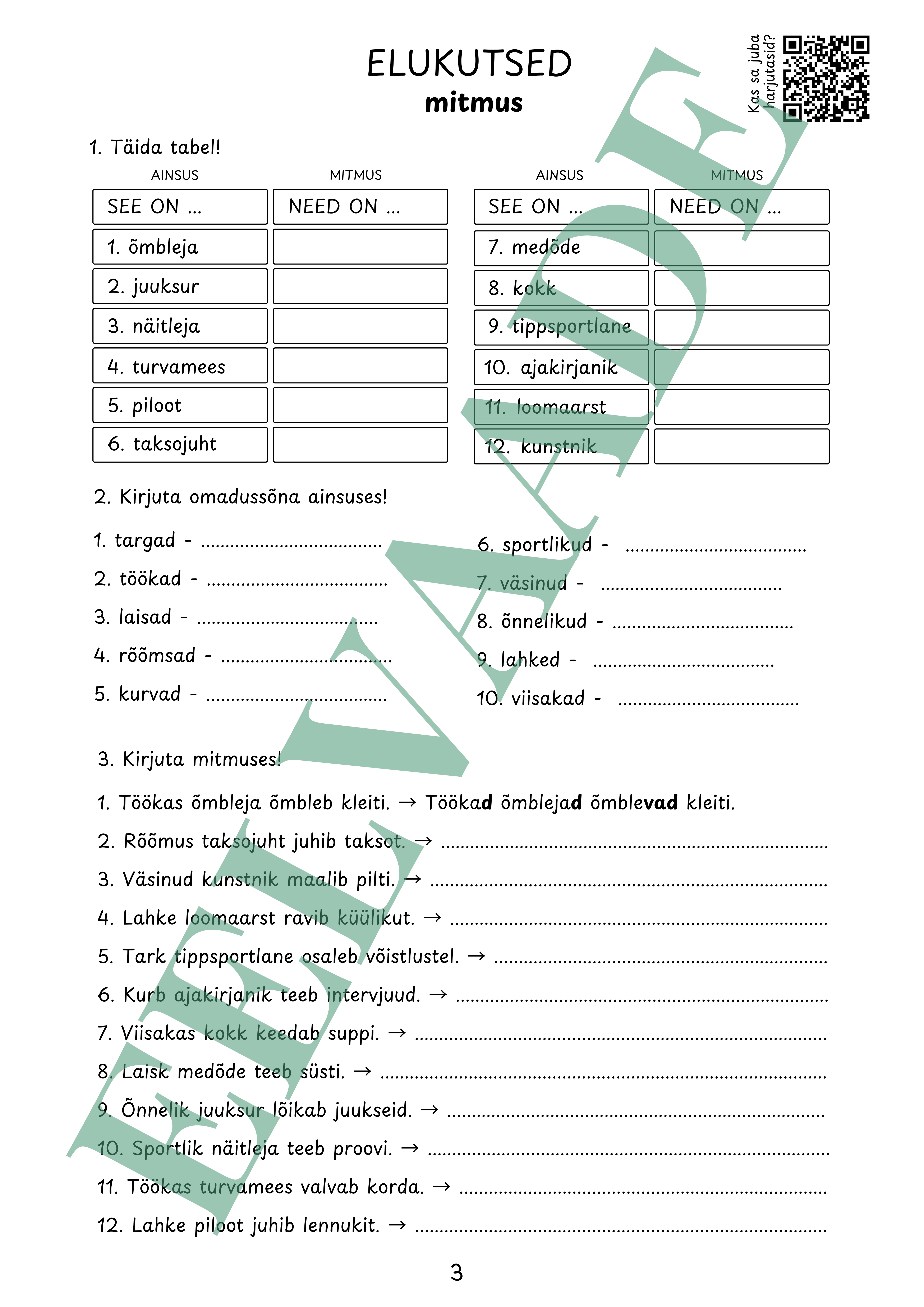 Töölehe abil harjutab õpilane mitmuse moodustamist. Lisaks on töölehel QR kood, mille abil saab veebis sama teemat harjutada.
