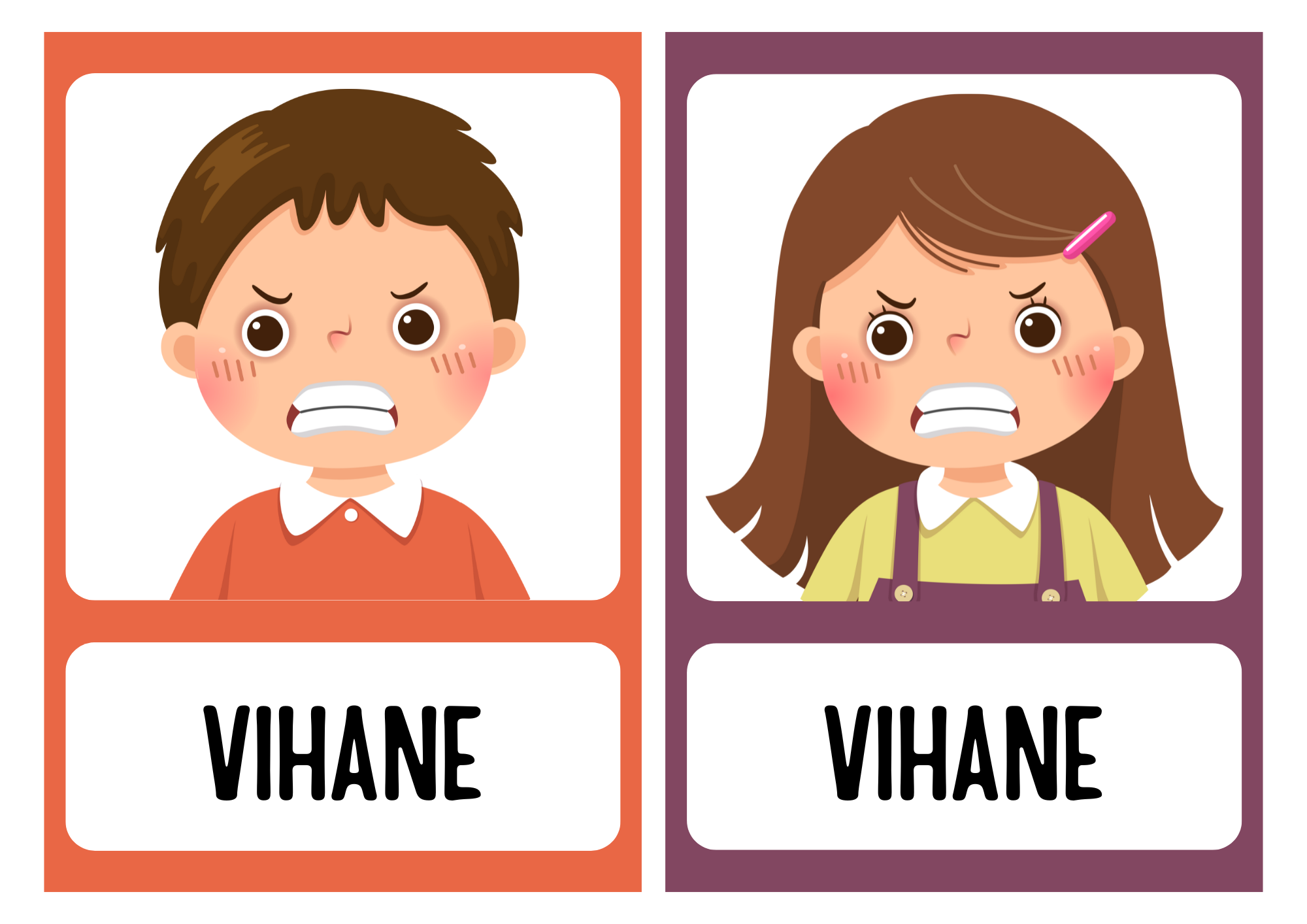 Vihane (poiss ja tüdruk), rõõmus (poiss ja tüdruk), kurb (poiss ja tüdruk), hirmunud (poiss ja tüdruk), tüdinud (poiss ja tüdruk), väsinud (poiss ja tüdruk), rahulolev (poiss ja tüdruk), segaduses (poiss ja tüdruk), üllatunud (poiss ja tüdruk), põnevil (poiss ja tüdruk).