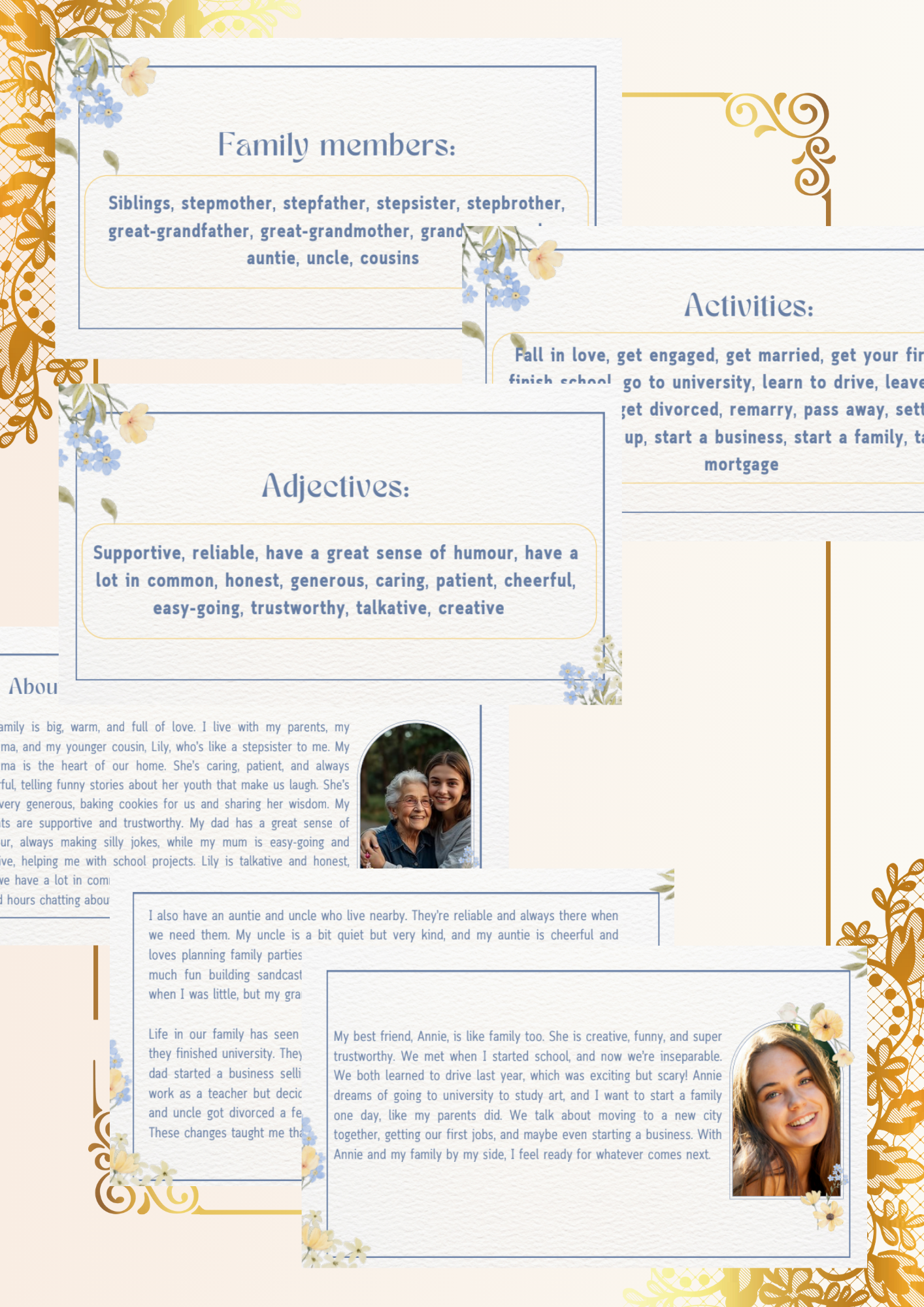 Esitlus “My Family & Friends” pakub õpilastele mitmekülgset keeletegevust üheks tunniks, koosnedes seitsmest slaidist kasulike fraaside ja sõnavaraga, mida saab kasutada oma perekonna ja sõprade kirjeldamisel. (family members, adjectives describing character, stages of life) ning ühest umbes 400-sõnalisest A2/B1 tasemel slängiga tekstist, mis on teismelistele huvitav.