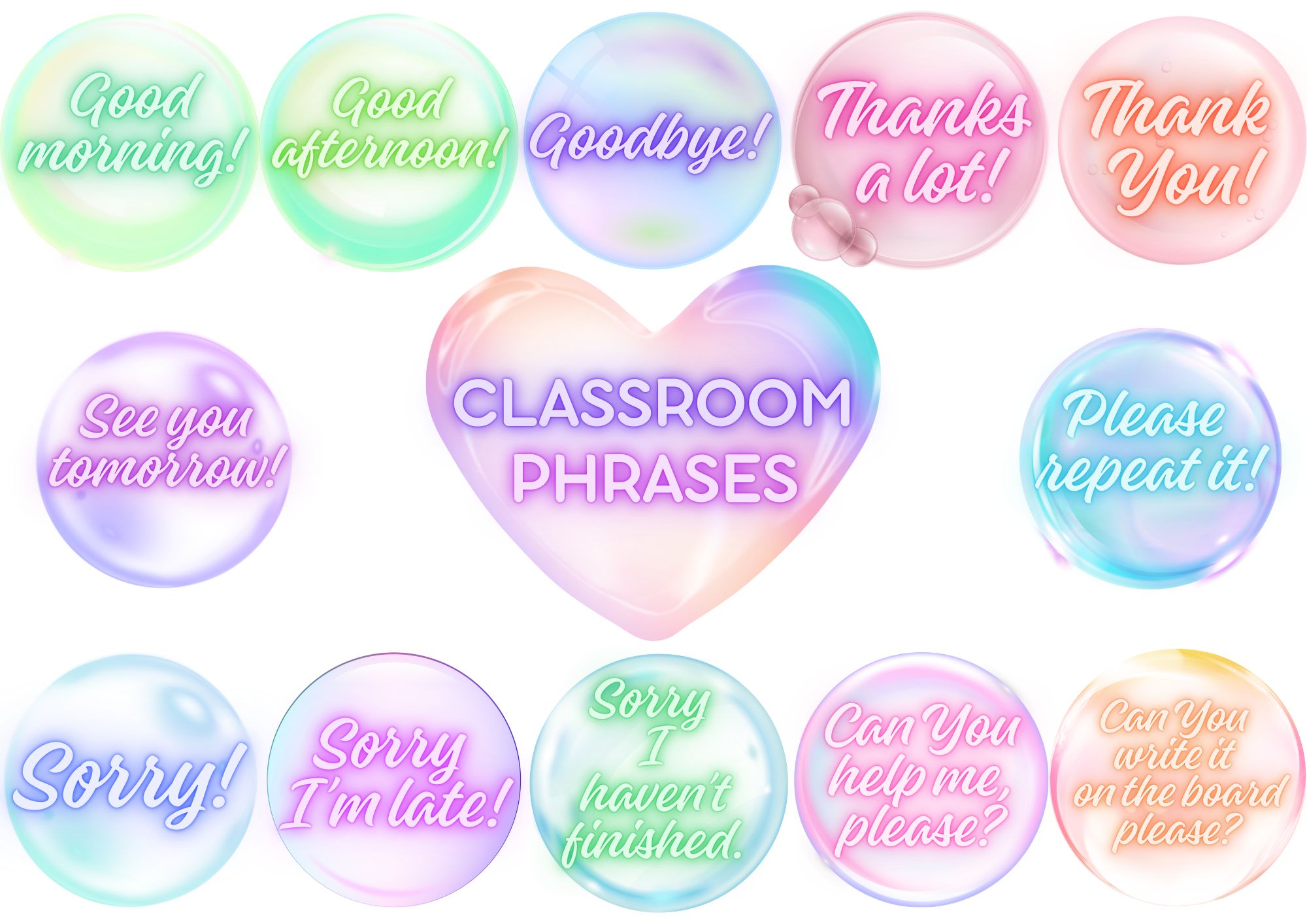 Fraasid ja viisakusväljendid inglise keele klassi seintele.