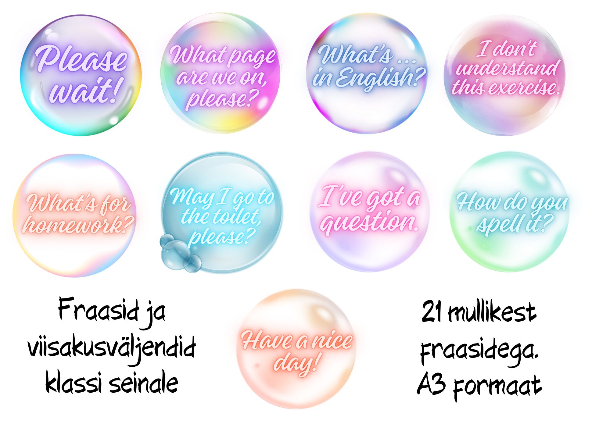 A3 formaat, 21 fraasi, ühel lehel kolm mulli fraasidega, kokku 7 lk + pealkiri.