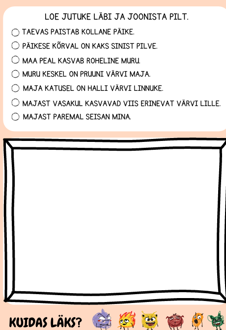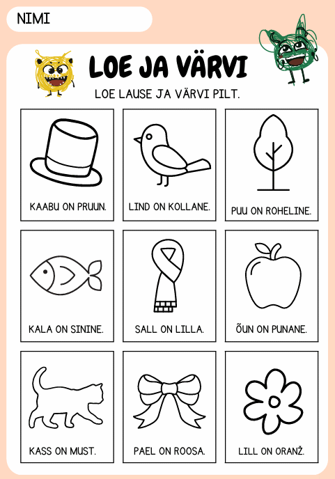 Funktsionaalse lugemise tööleht eelkooli või 1.klassi õpilasele. Tööleht on 2-poolne.