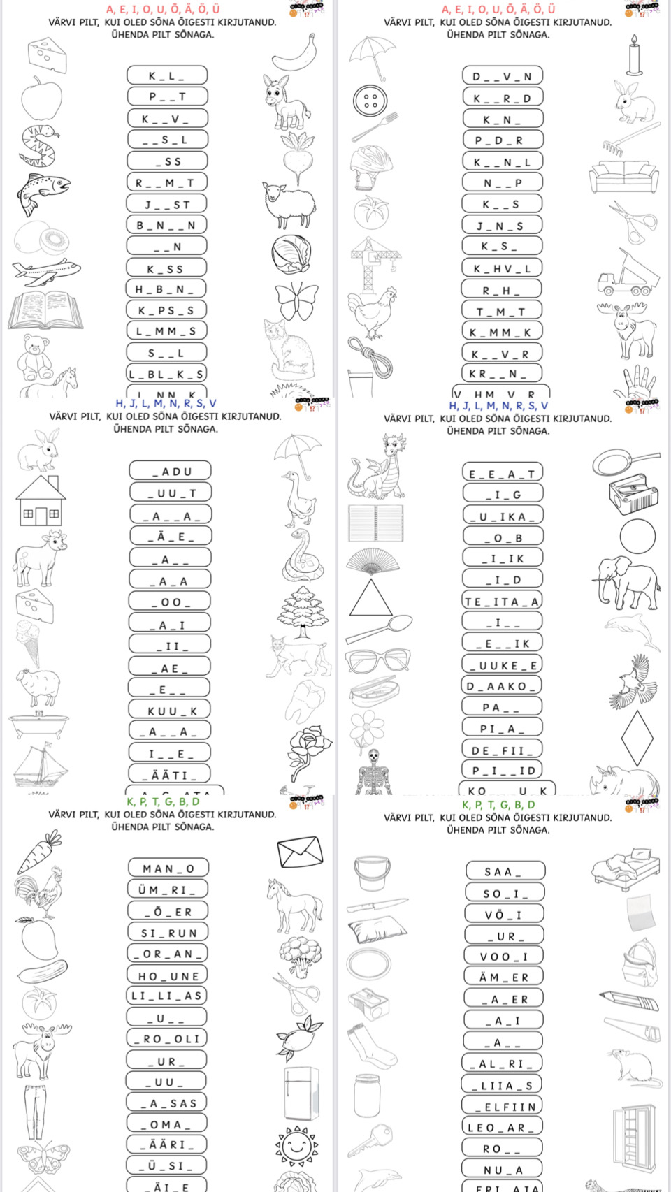 Leia häälikud, kirjuta puuduvad tähed, värvi, ühenda sõna pildiga.