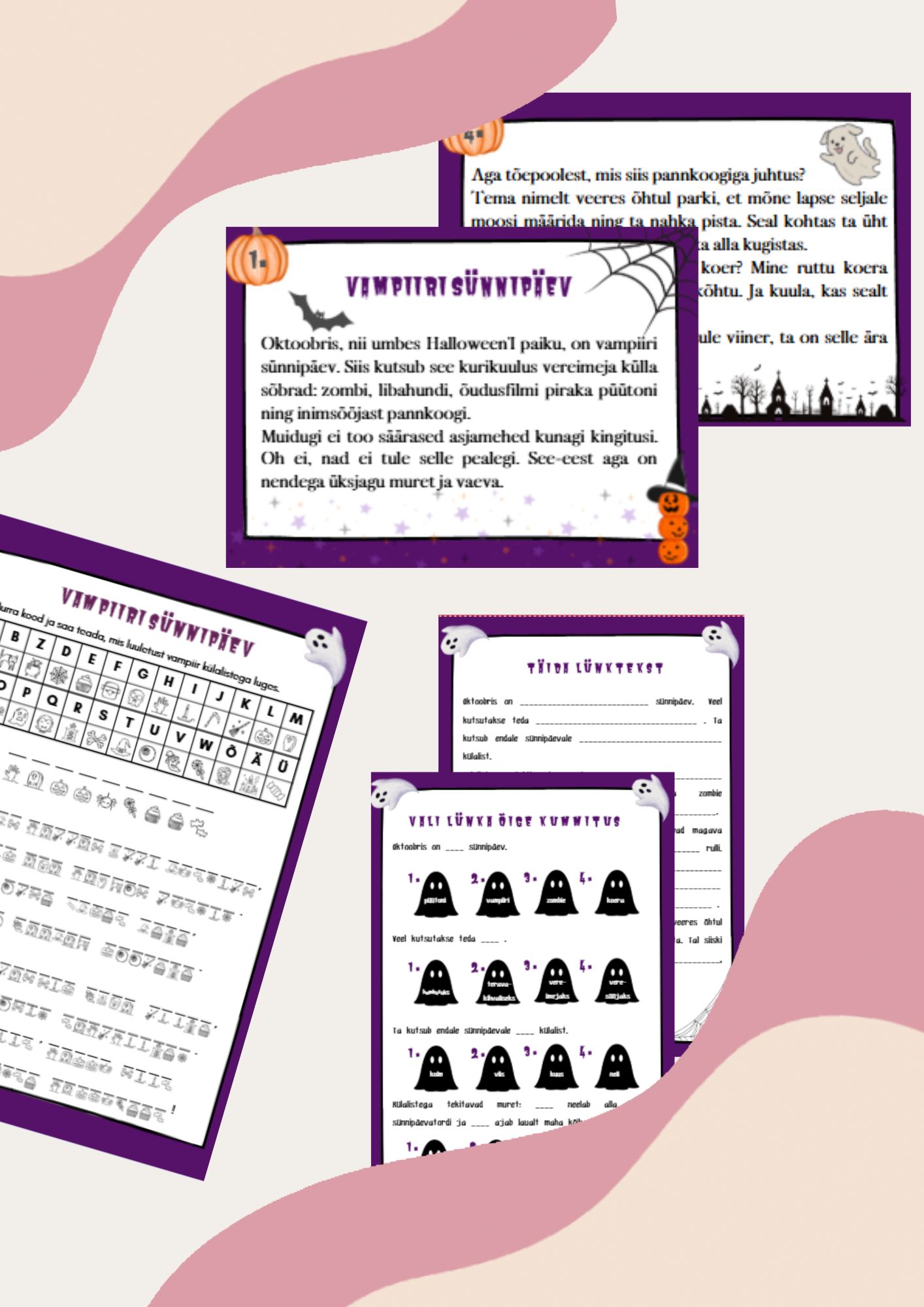 Lugemispala “Vampiiri sünnipäev” on jaotatud neljale nummerdatud jutukaardile. Lamineeri ja aseta jutt seintele ja loe liikudes!