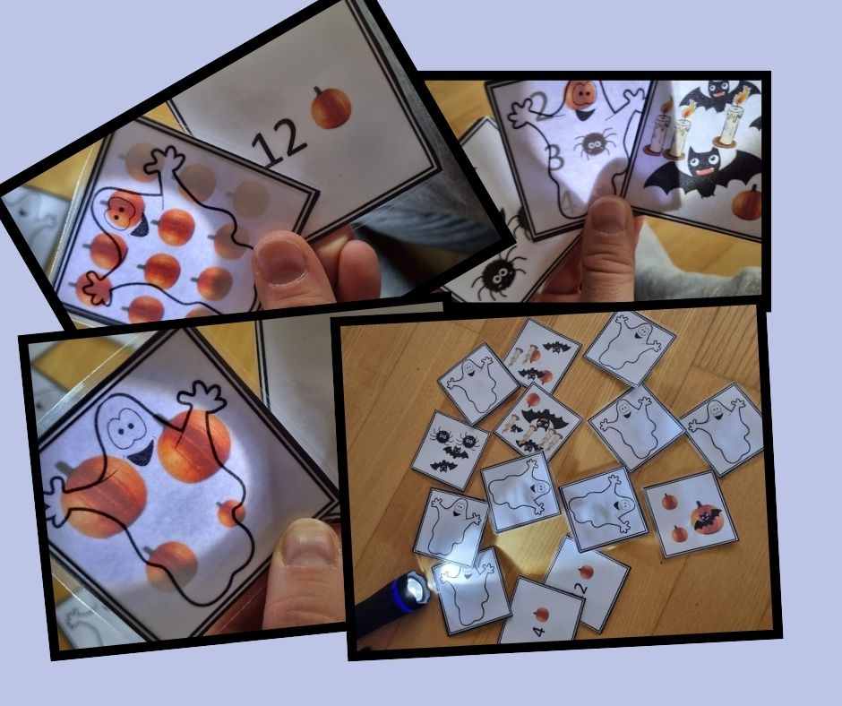 2) kleebi väikese liimitäpiga kaks kaarti kokku (kummituse pilt + peidupilt/otsimiskaart), et need koos püsiksid ja lamineerides viltu ei vajuks. See, kas paned otsimiskaardid ka kummituse taha “peitu”, on iseenda valik.. sellest oleneb, milline on ülesande raskusaste.