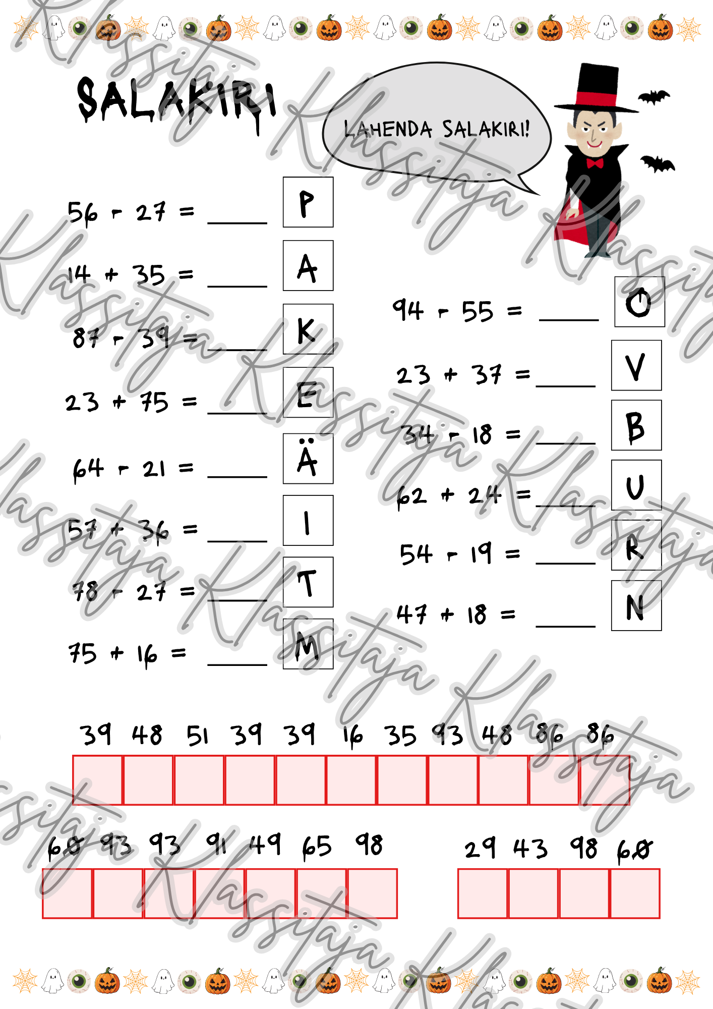 10 põnevat ja mängulist halloween’i-teemalist töölehte algklassidele. Töölehtedelt leiab nii arvutamis-, kirjutamis-, nuputamis- kui ka värvimisülesandeid. Materjalis on kokku 11 lehekülge: