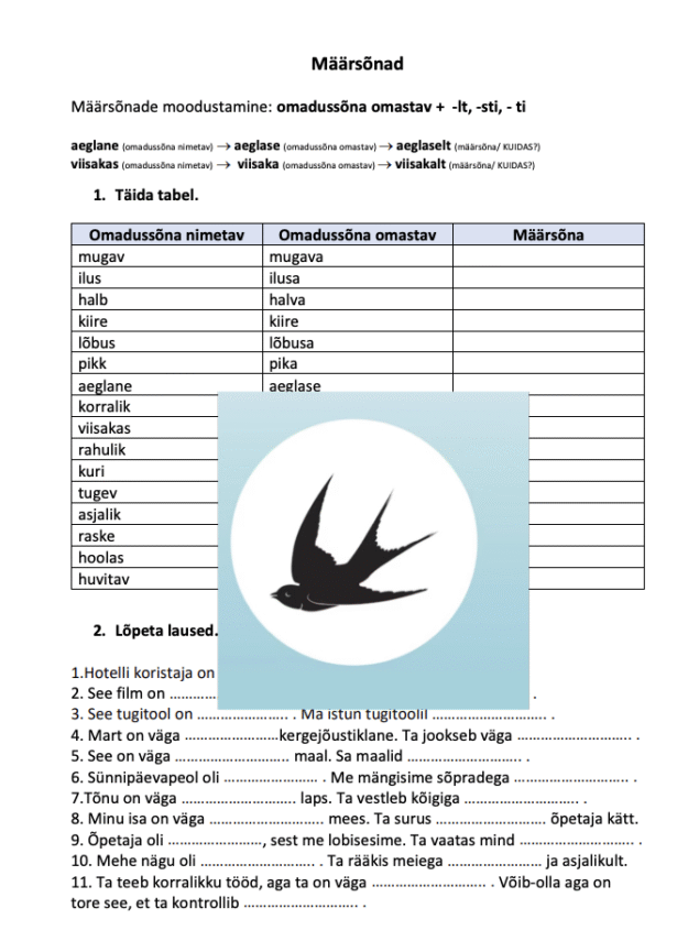Määrsõnade harjutamise ülesanne. Fail sisaldab kolm ülesannet: tabeli täitmine ja kaht ülesannet, milles õpilased peaksid valima omadussõna ja määrsõna vahel.