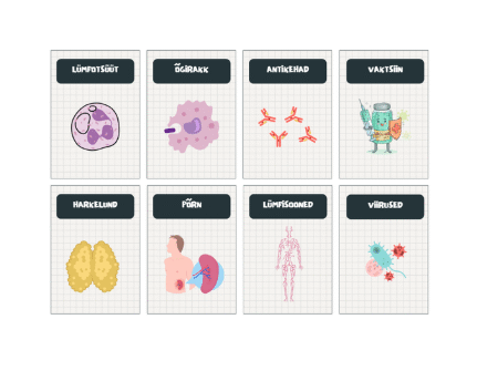 Immuunsüsteemi jutukaardid bioloogiatundi immuunsüsteemi teema õppimiseks. Failis on kokku 8 kaarti, mis sisaldavad immuunsüsteemi teemaga seonduvaid mõisteid koos vastavate piltidega.