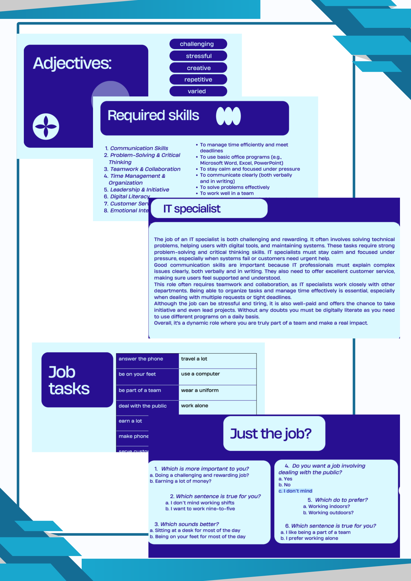Esitlus “Jobs & Employment” pakub õpilastele mitmekülgset keeletegevust üheks tunniks, koosnedes kuuest slaidist kasulike fraaside ja sõnavaraga, mida saab kasutada eriala kirjeldamisel. (adjectives describing jobs, job tasks, required job skills, pair work “Just the job”?) ning ühest umbes 200-sõnalisest A2/B1 tasemel slängiga tekstist, mis on teismelistele huvitav.