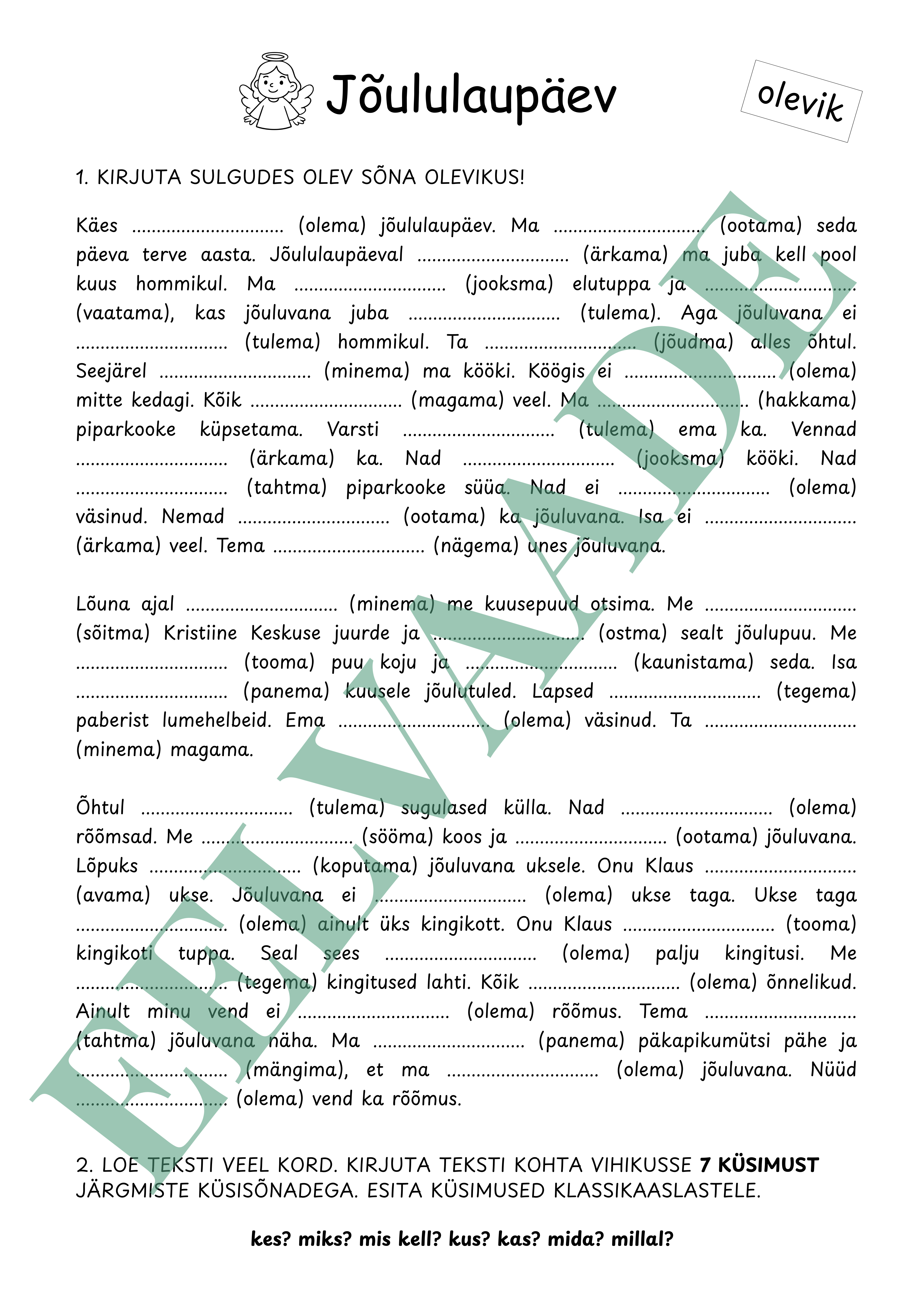 Grammatika- ja lugemisülesanne “Jõululaupäev”. Õpilased loevad teksti jõululaupäevast ning panevad samal ajal tegusõnad olevikus õigesse pöördesse. Pärast lugemist saab teha ise teksti kohta etteantud küsisõnadega küsimusi ning neid klassikaaslastele esitada.