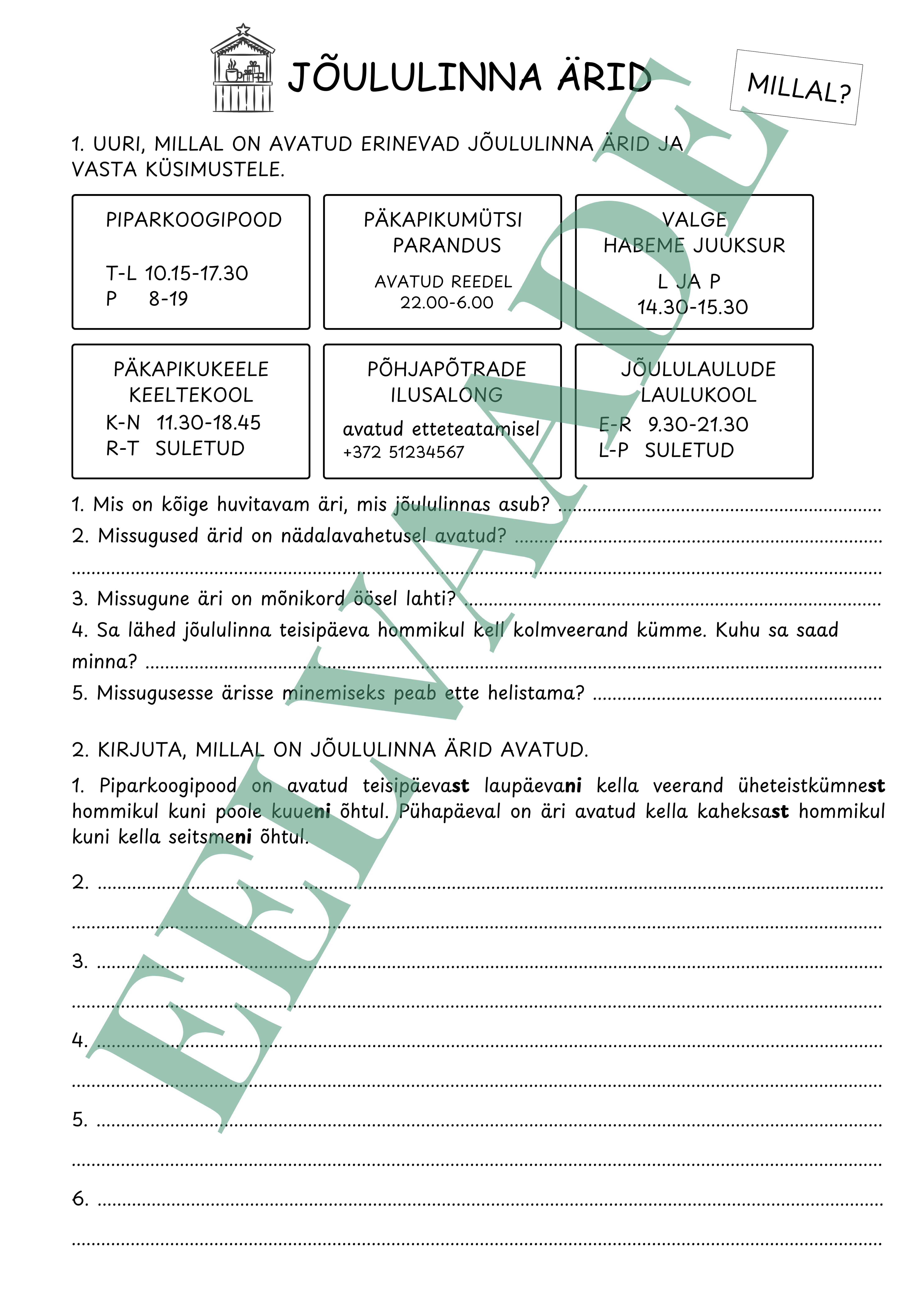 Töölehe “Jõululinna ärid” abil saab harjutada avamisaegade ütlemist (mis kellast mis kellani? mis päevast mis päevani?). Seda kõike toredas jõulukontekstis! Millal on avatud põhjapõtrade ilusalong? Aga päkapikumütsi parandus?