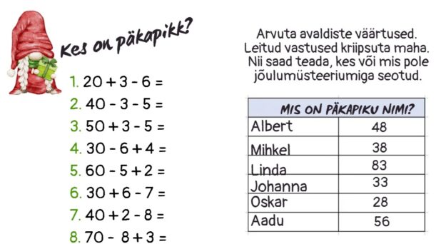 Arvuta avaldiste väärtused. Leitud vastused kriipsuta maha. Nii saad teada, kes või mis pole jõulumüsteeriumiga seotud. Avaldisi on 20, kuid vastuseid on 23. Vastused, mis üle jäävad, ongi jõulumüsteeriumi lahenduseks.