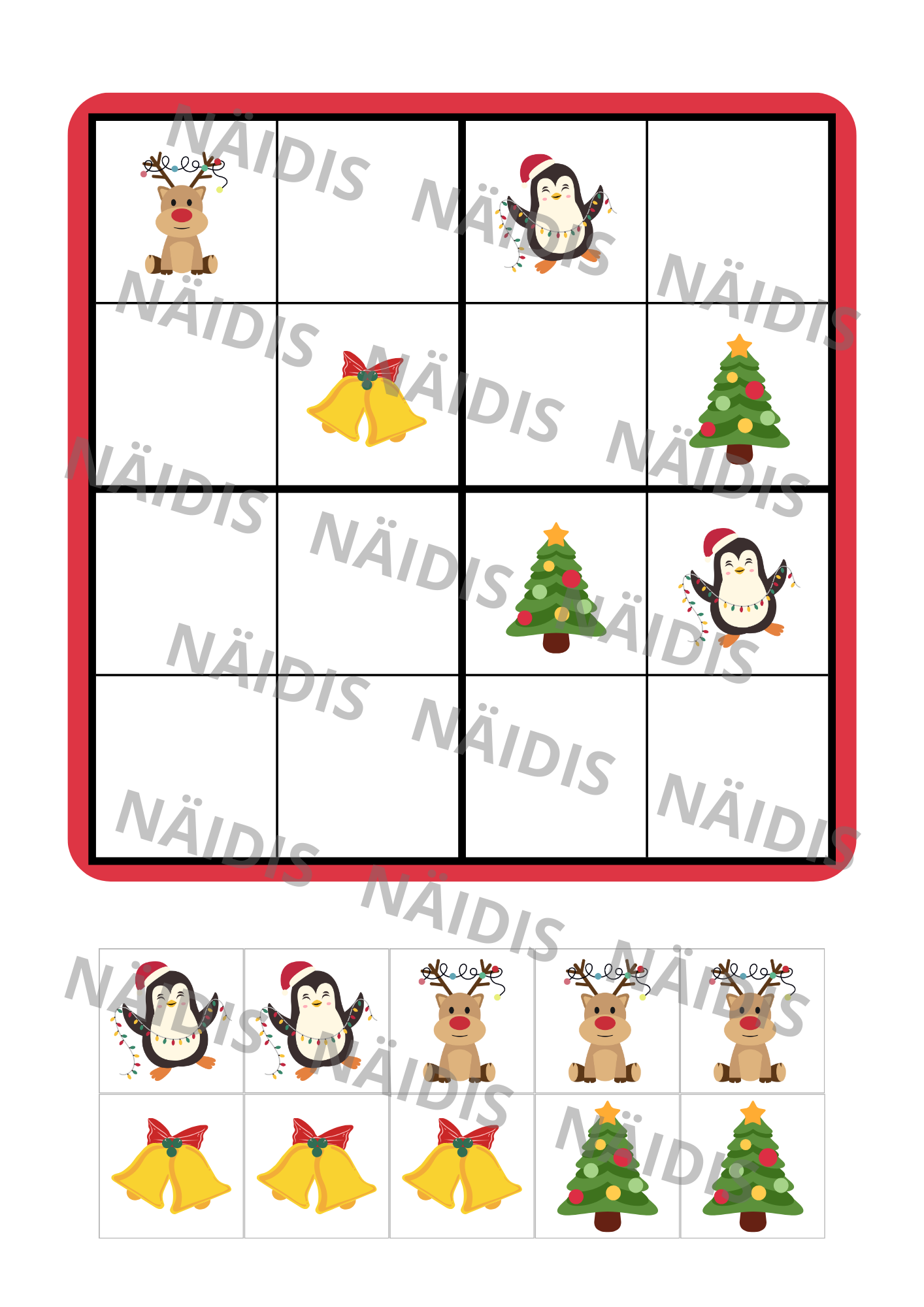 - Lõika välja ja kleebi pildid õigesse kohta nii, et igas reas (nii horisontaalselt kui ka vertikaalselt) oleks igat pilti ainult üks.