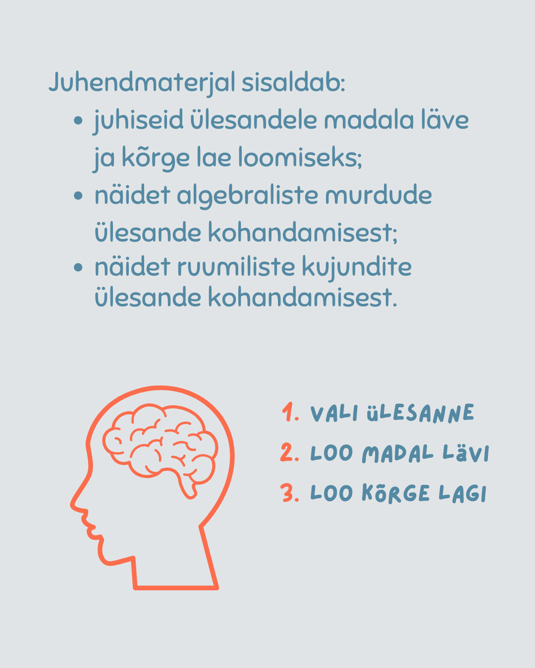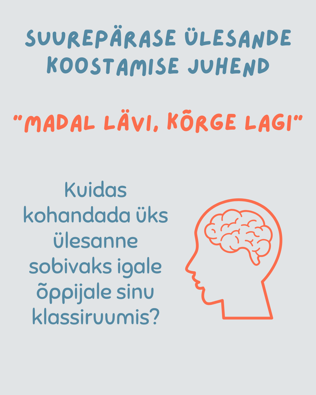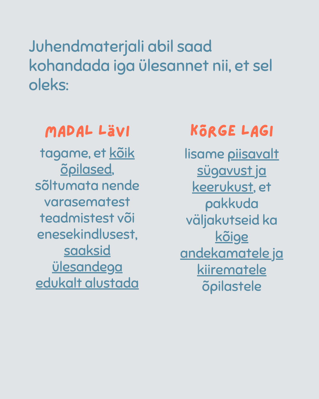 Juhendmaterjal õpetajale iga ülesande kohandamiseks kogu klassile. “Madal lävi, kõrge lagi” (ingl low floor, high ceiling) vormis ülesandega tagame, et: