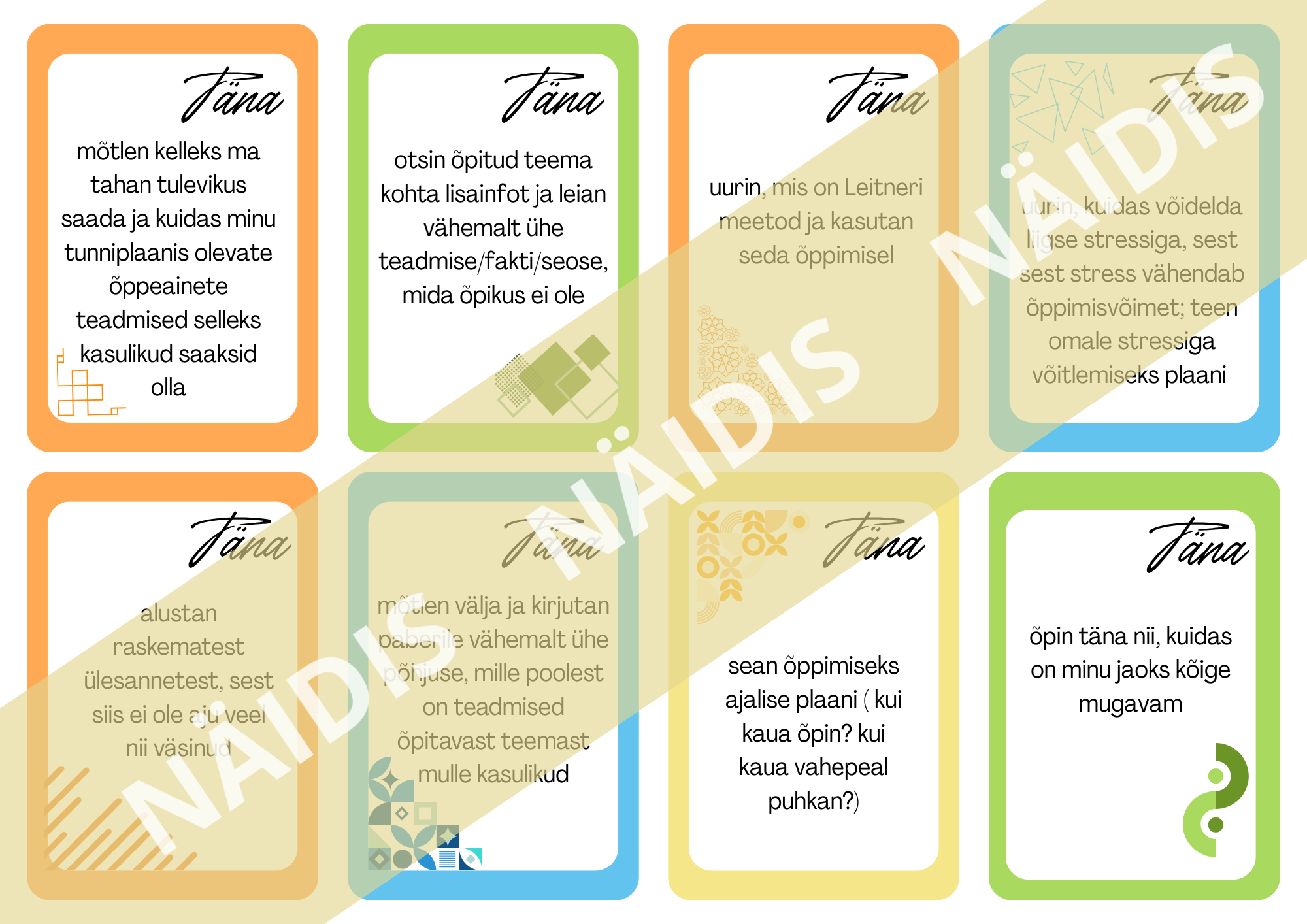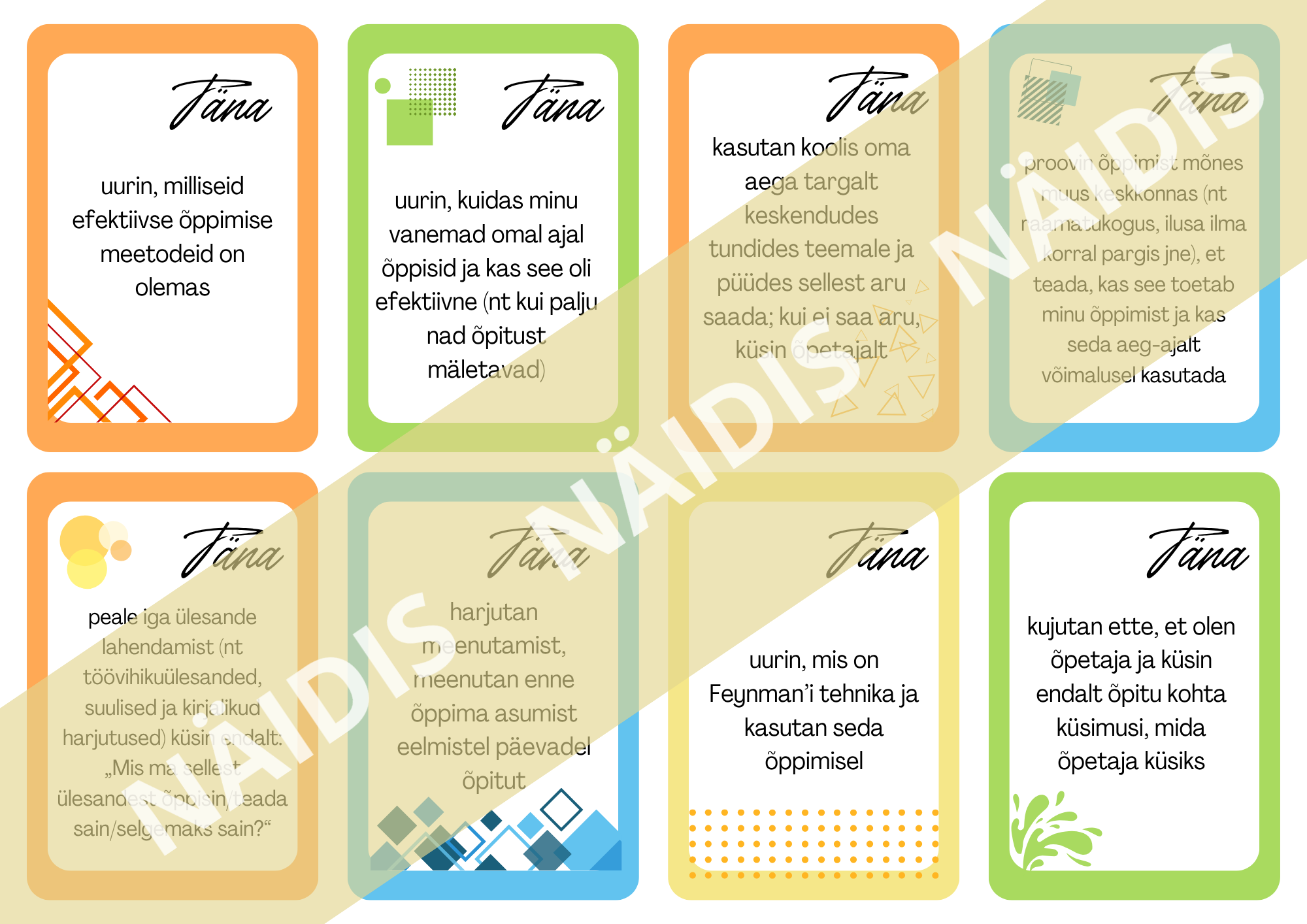 Failis on 63 kaarti, mis aitavad tähelepanu pöörata õppimisele ja õppimisharjumustele. Igaks päevaks saab omale valida või loosida ühe ülesande. Kasutusest välja võib jätta ülesanded, mis on liiga keerulised või ei ole teostatavad.