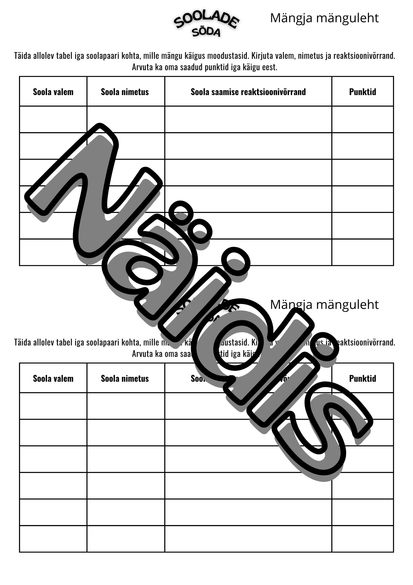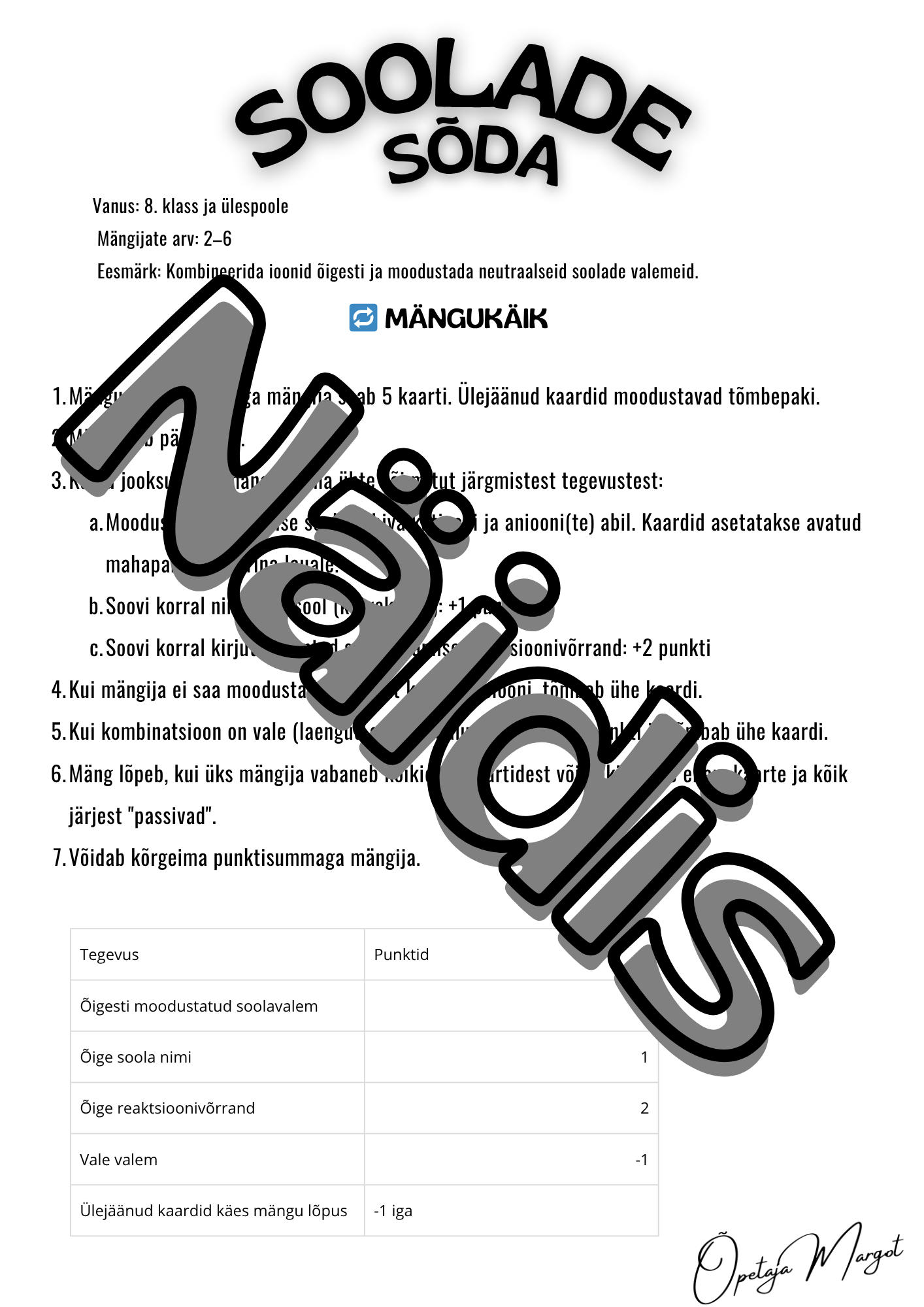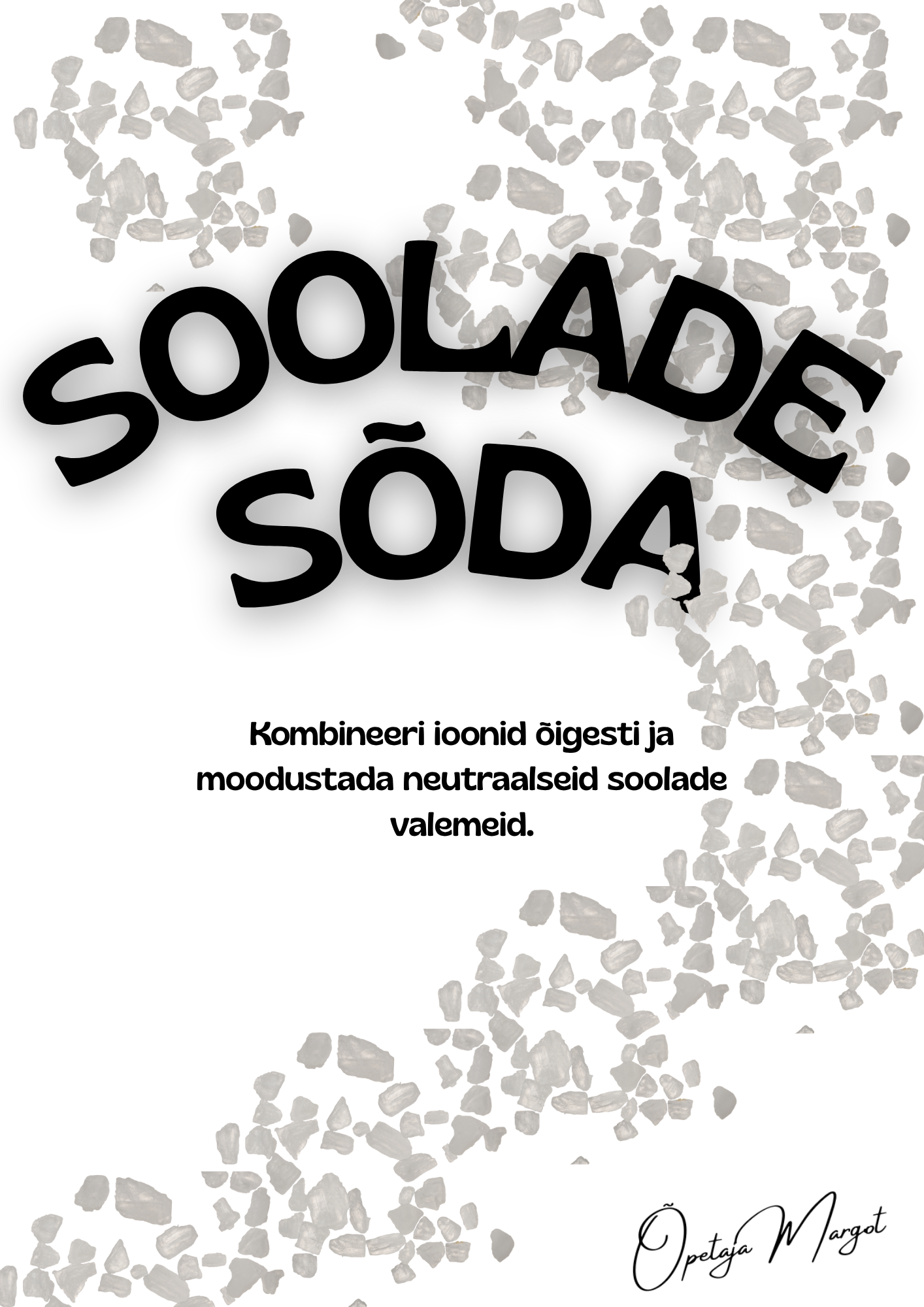 „Soolade sõda“ on õppeotstarbeline ja samas mänguline keemiakaardimäng 8. klassist alates. Mängijate ülesandeks on sobitada omavahel katioone ja anioone, moodustades laengult neutraalseid soolade valemeid. Täiendava põnevuse loob võimalus koguda lisapunkte soola nimetamise ja reaktsioonivõrrandi kirjutamise eest. Mäng arendab keemilist mõtlemist, süvendab teadmisi soolade koostisest ning sobib suurepäraselt tunnitegevuseks, koduseks kordamiseks või õpilastevahelisteks võistlusteks. Komplektis on kaardid, mängujuhend ning mängija töölehed — prindi, lõika, lamineeri ja alusta mängu!