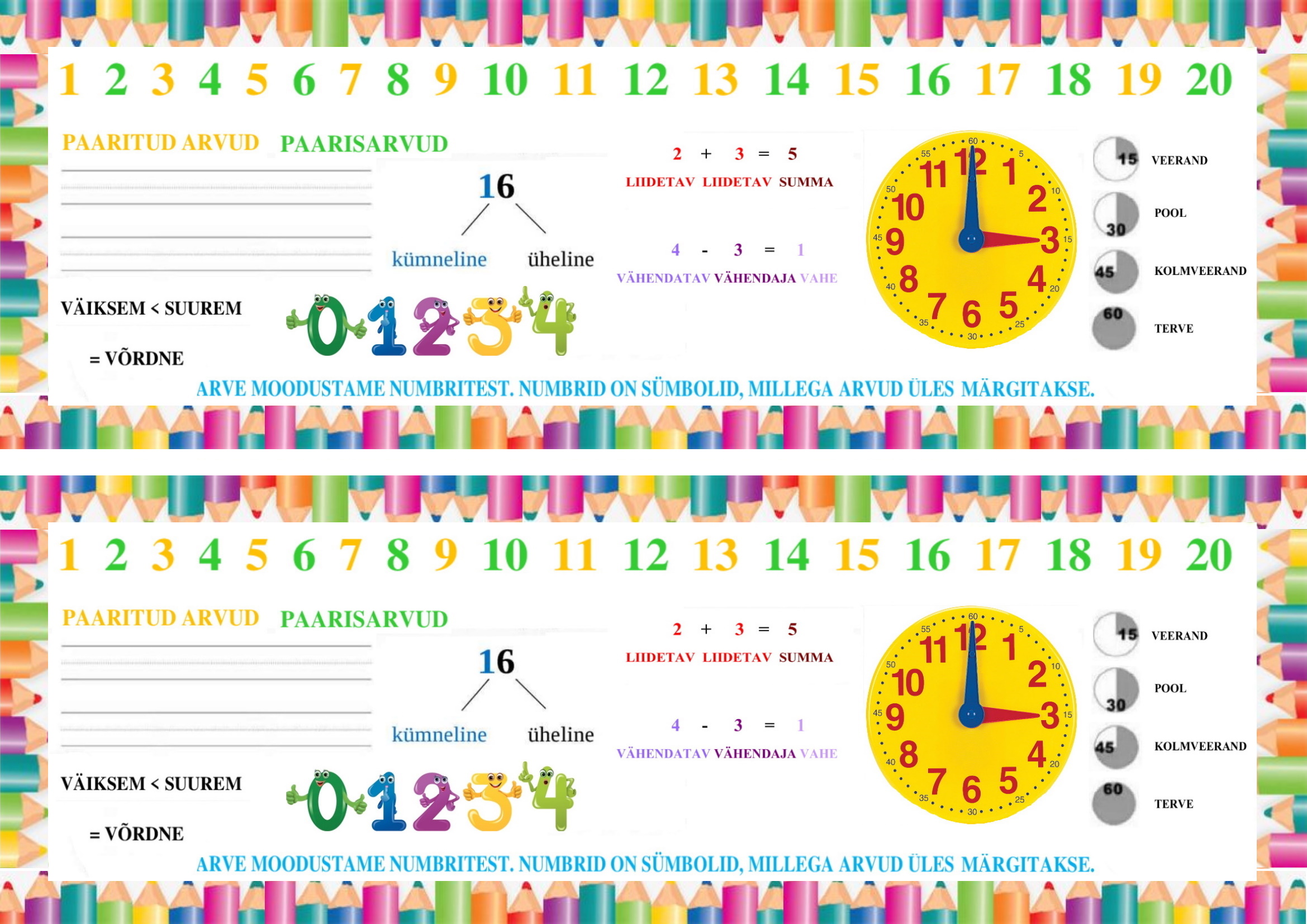 Sisaldab olulisi 1. klassis omandatavaid teadmisi. Järjehoidjal on koht õpilase nime jaoks. Võimalus printida ja lamineerida.
