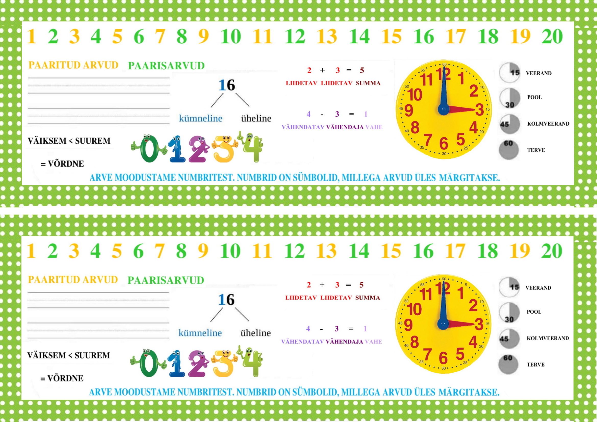 Sisaldab olulisi 1. klassis omandatavaid teadmisi. Järjehoidjal on koht õpilase nime jaoks. Võimalus printida ja lamineerida.
