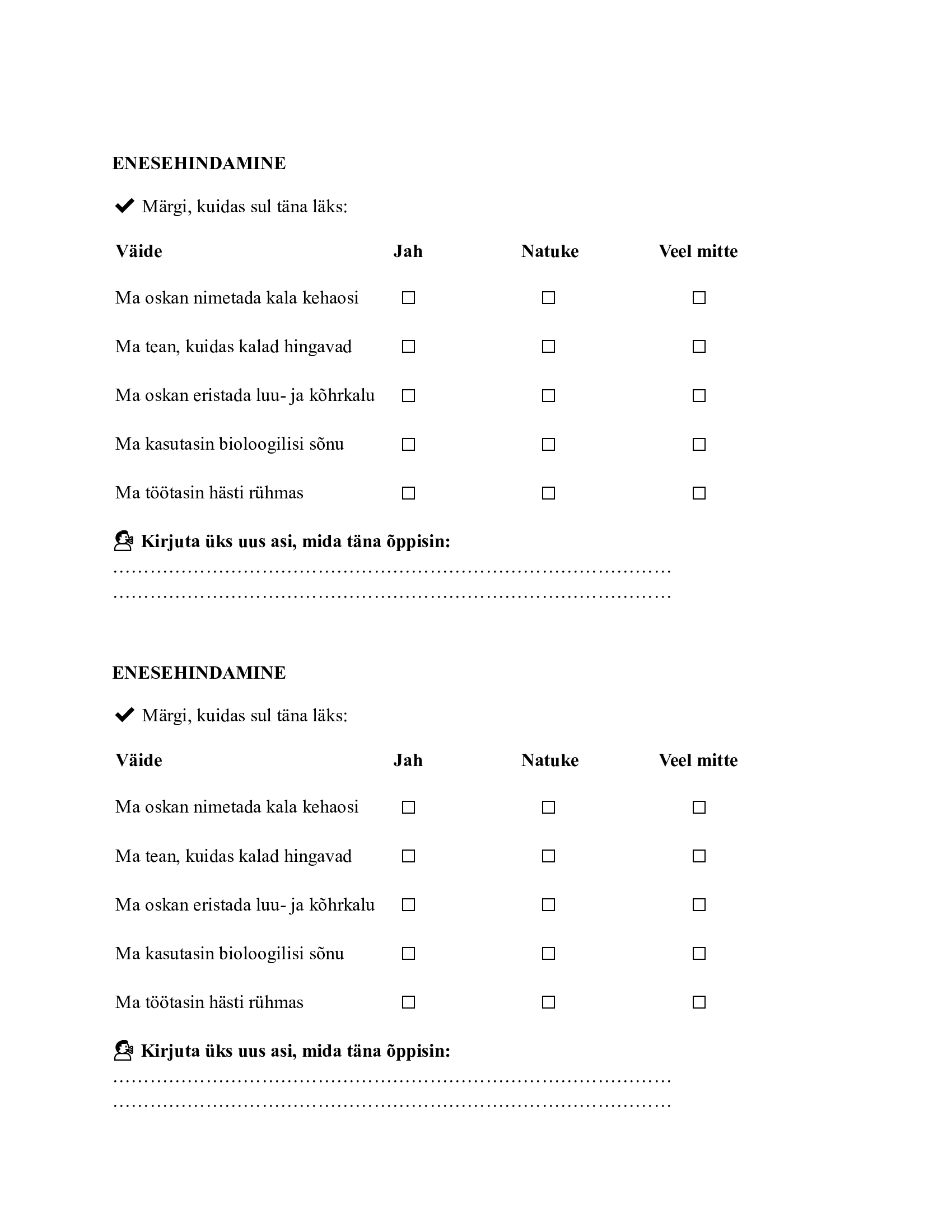 Enesehindamise tööleht kalade teema lõpetuseks.