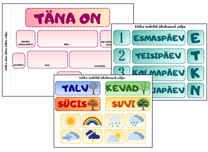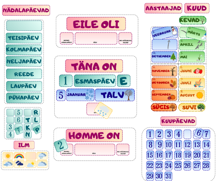 Komplektis on: nädalapäevad (+ numbrid ja algushäälikud), kuupäevad, aastaajad, kuud, ilm + alused igale kategooriale. Kokku 14lk.