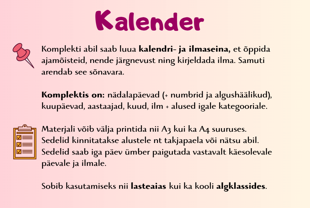 Komplekti abil saab luua kalendri- ja ilmaseina, et õppida ajamõisteid, nende järgnevust ning kirjeldada ilma. Samuti arendab see sõnavara.