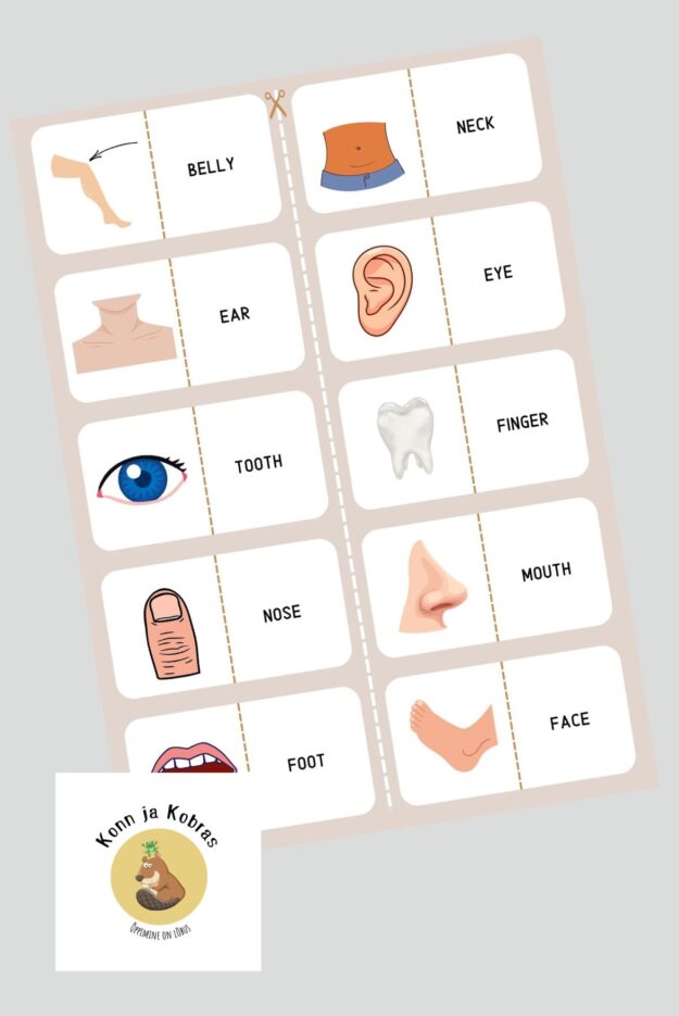 Doomino mäng kehaosade nimetustega (inglise keeles). 20 nimetust ja 20 pilti.