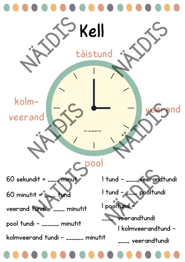 Kella õppimise tööleht. Töölehte saab teha õppimisprotsessis või teema kinnistamiseks.