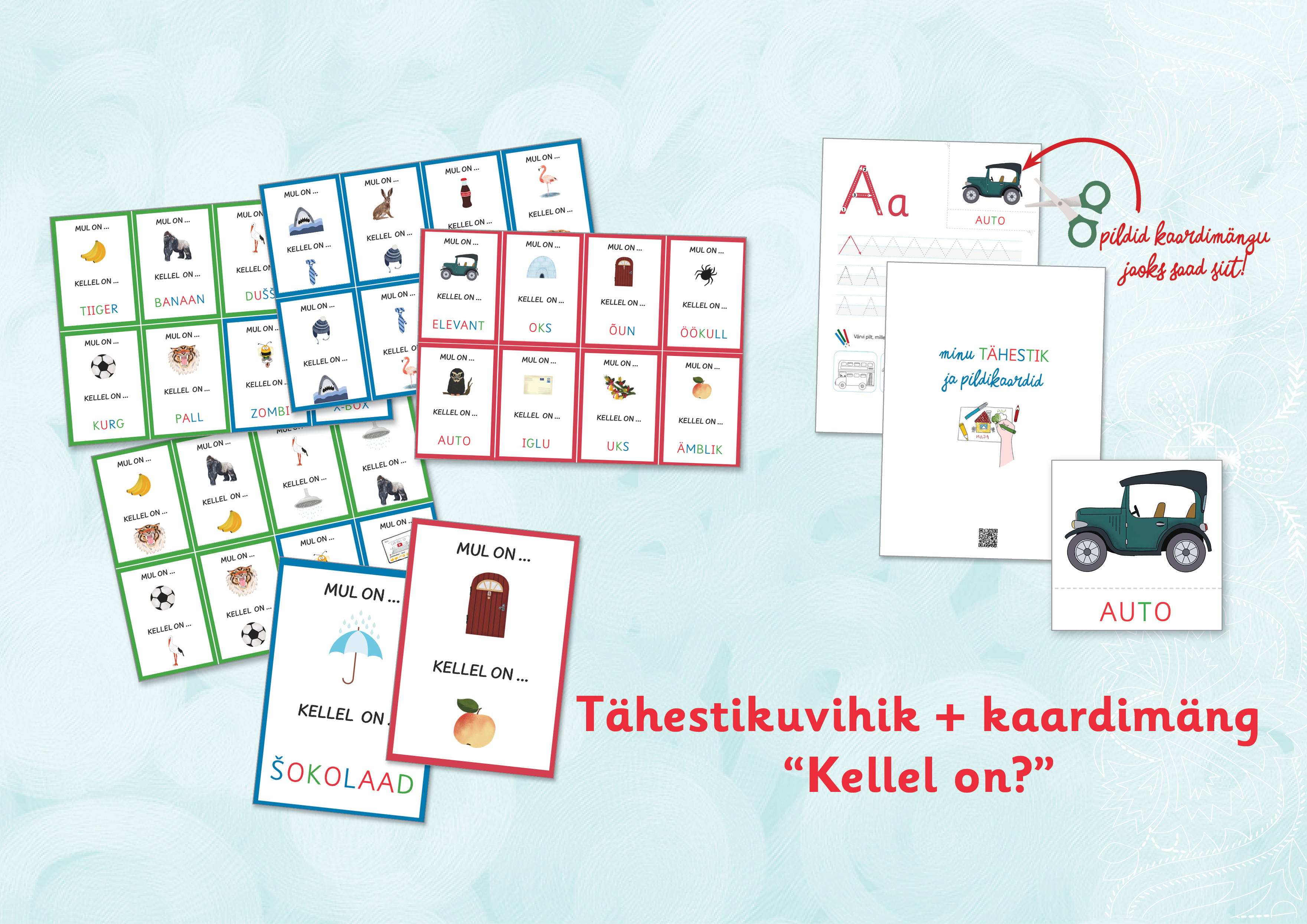 Tähestikuvihik pildikaartidega + 2x mängukaardid “Kellel on?”