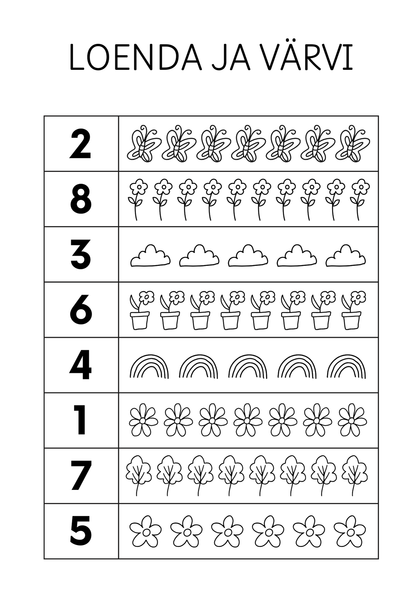 Kirja eelharjutused, 10 piires loendamine ja värvimine.