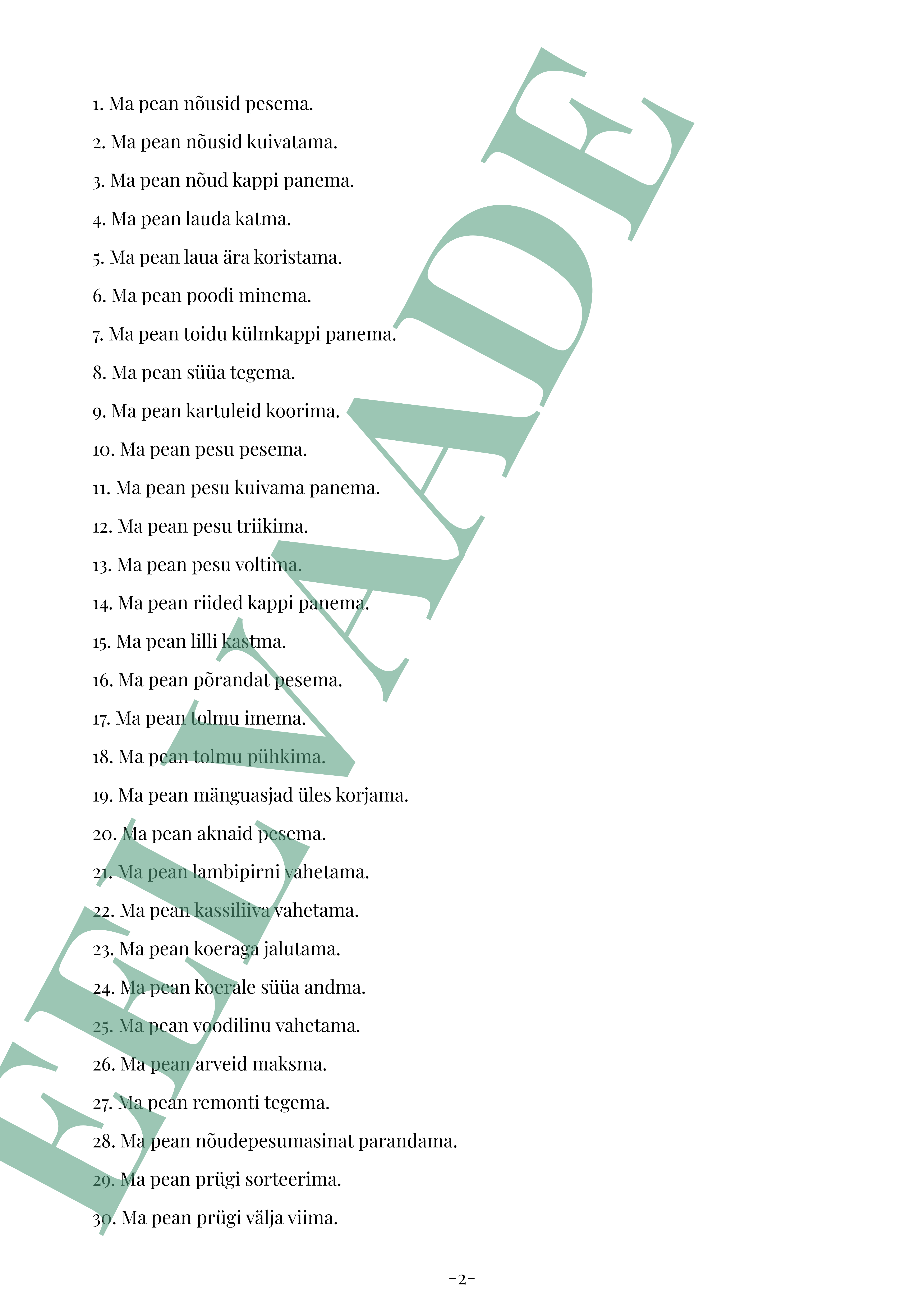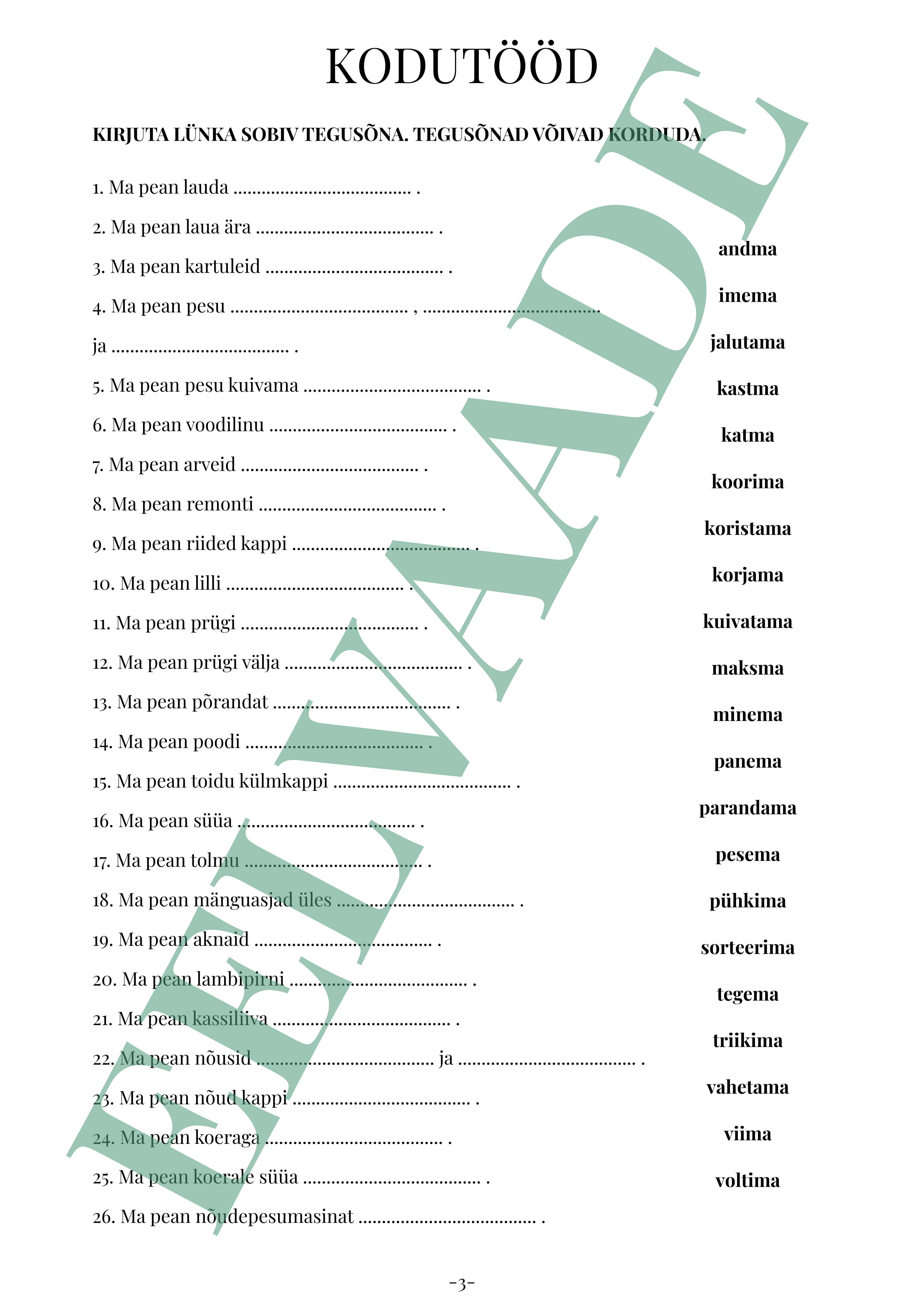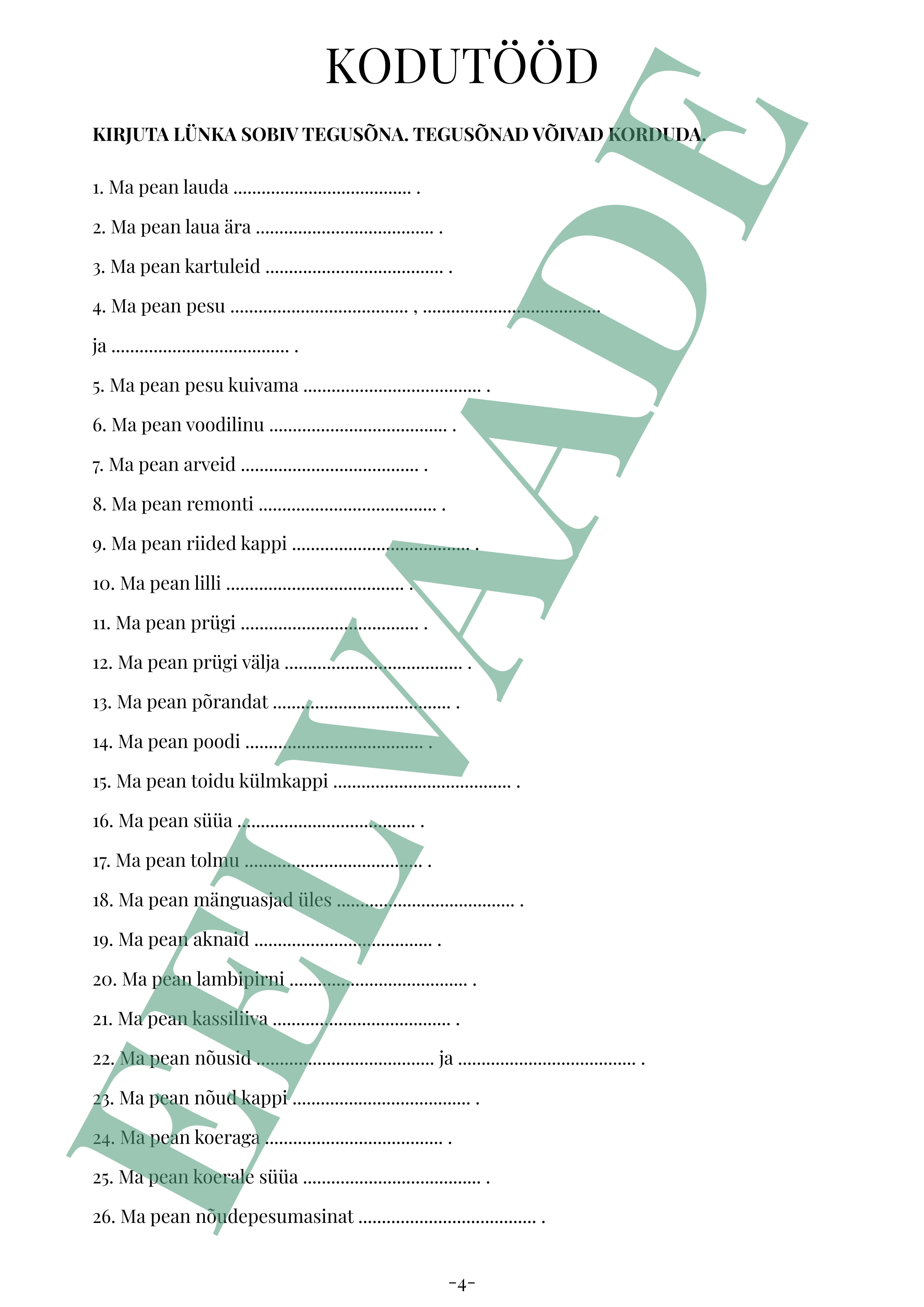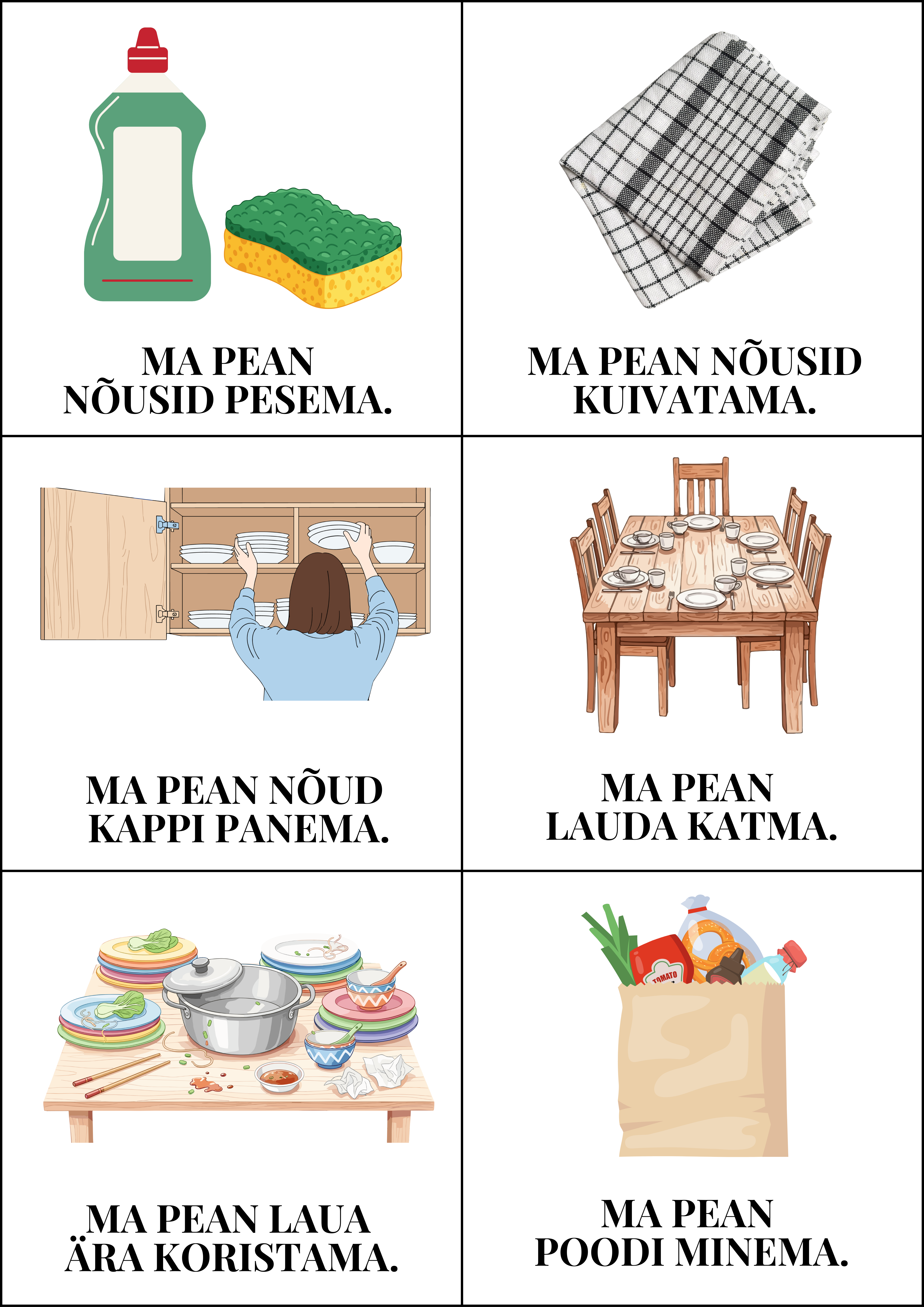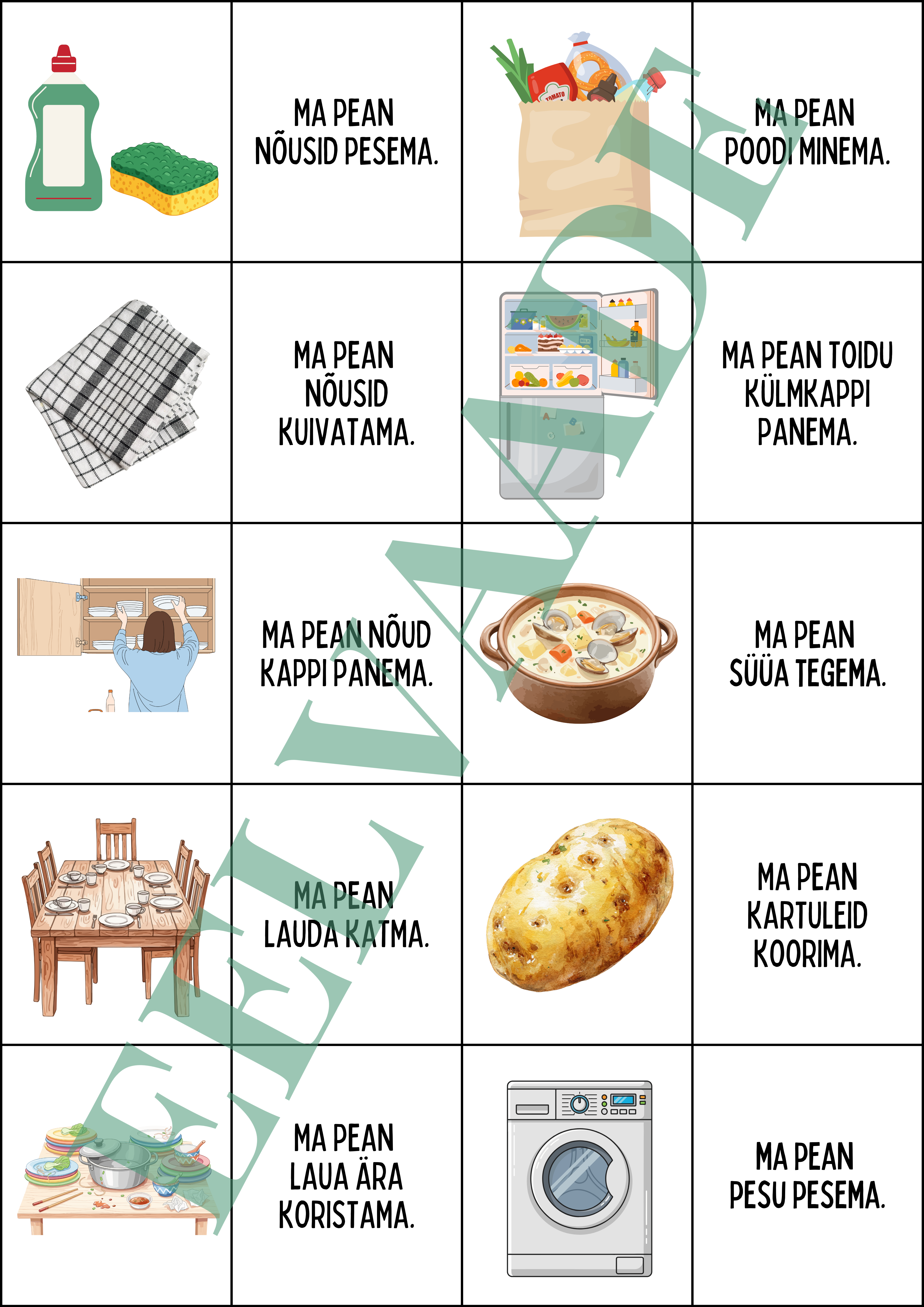 Pildikaartide komplekt töölehega KODUTÖÖDEST  (majapidamistööd). Ma pean …. + mida tegema? (30 lauset).